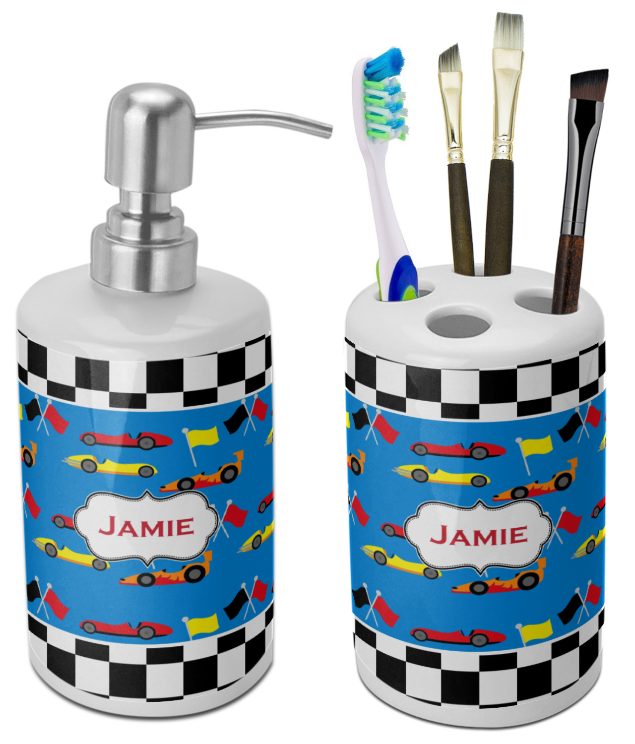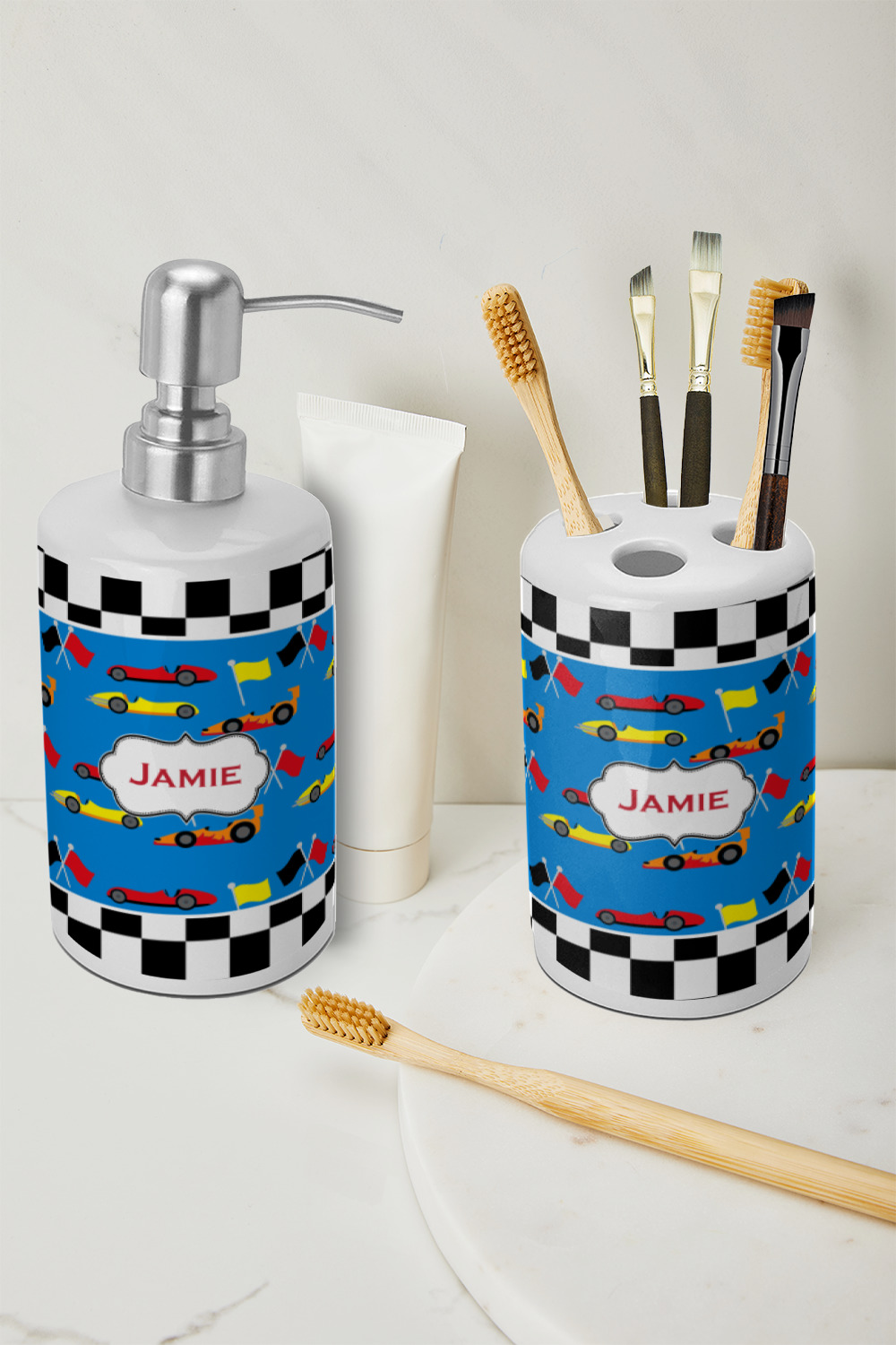 This two piece, ceramic bathroom set will add the perfect splash of color to any bathroom. This set includes one pump dispenser, ideal for soap or lotion, and one toothbrush holder with four holes. Although originally designed for toothbrushes, the holder will also hold make-up brushes, nail files, and other bathroom tools.