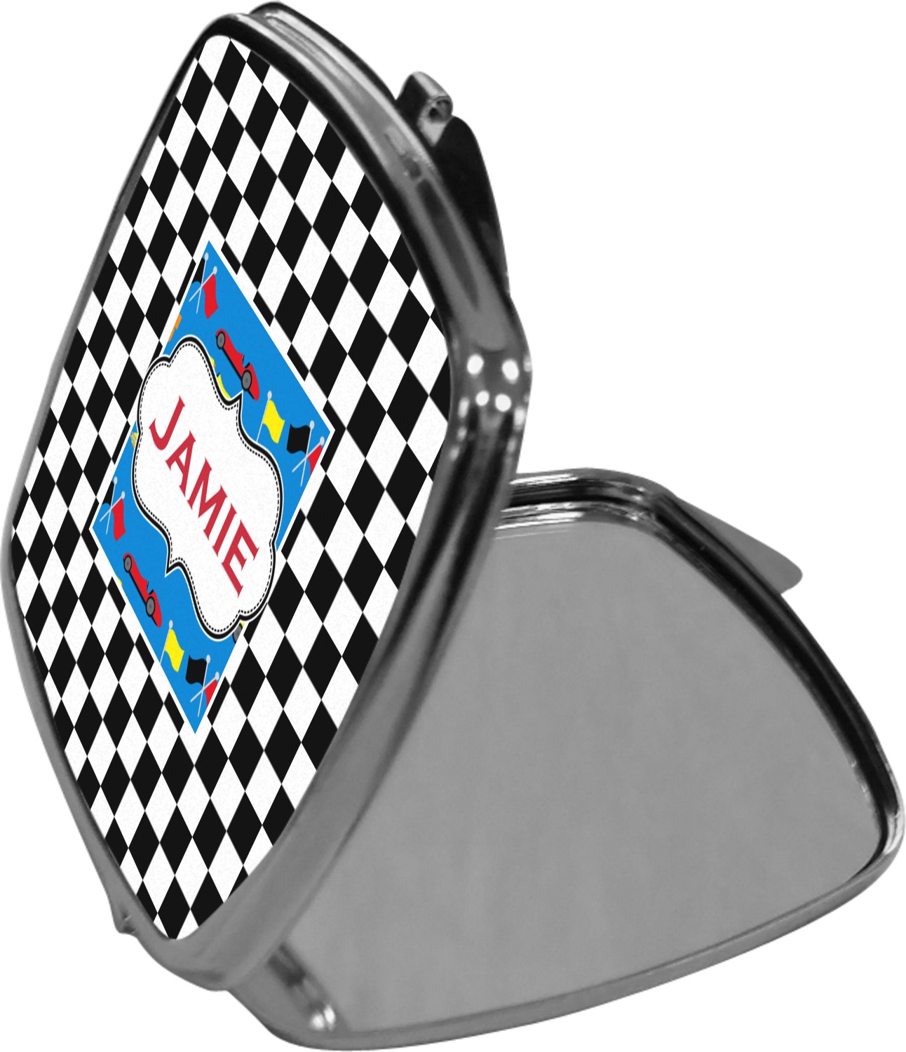 Our compact mirrors are customized with your design on one side. The other side is patterned silver tone metal. Inside, there are two mirrors.