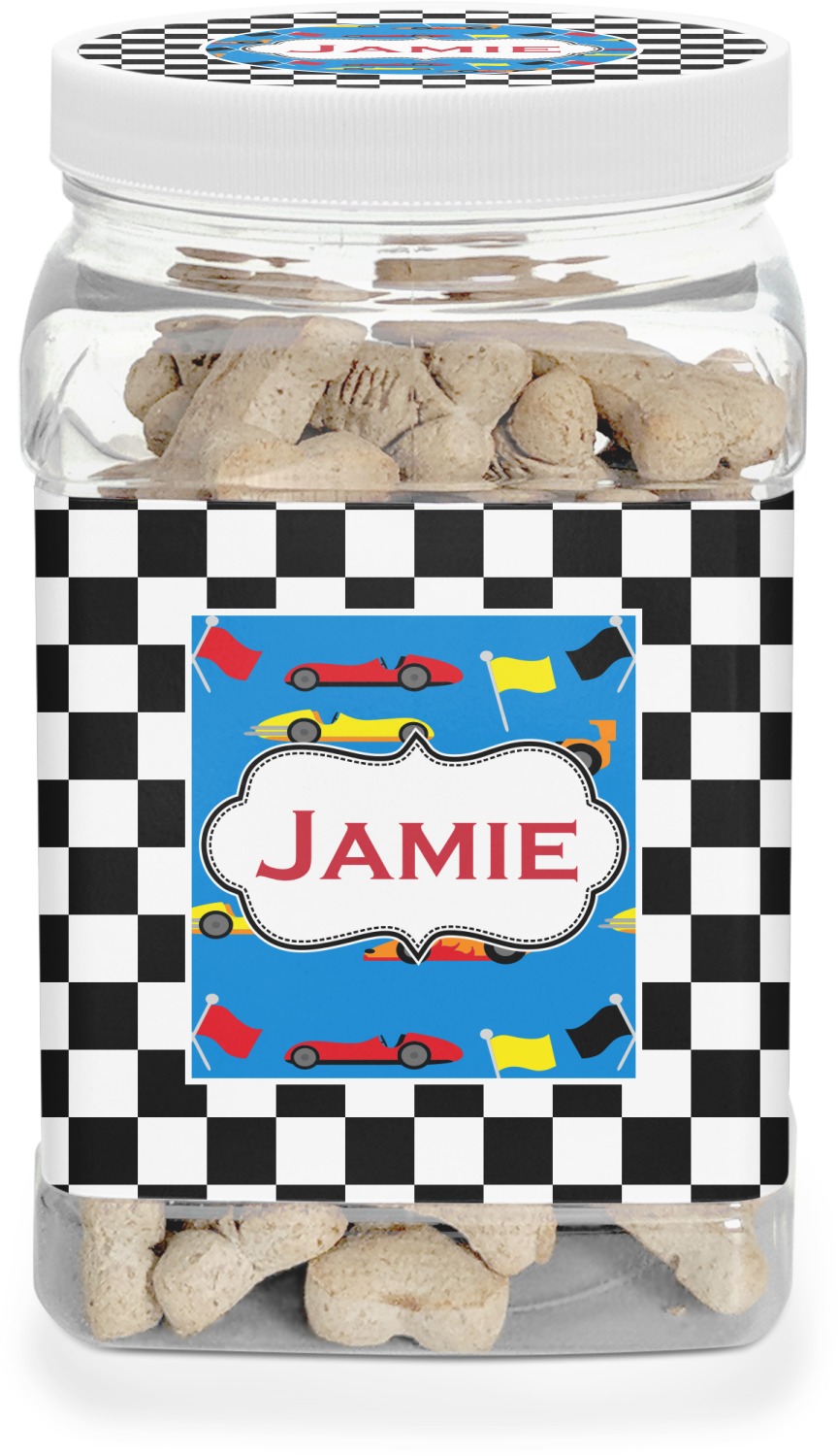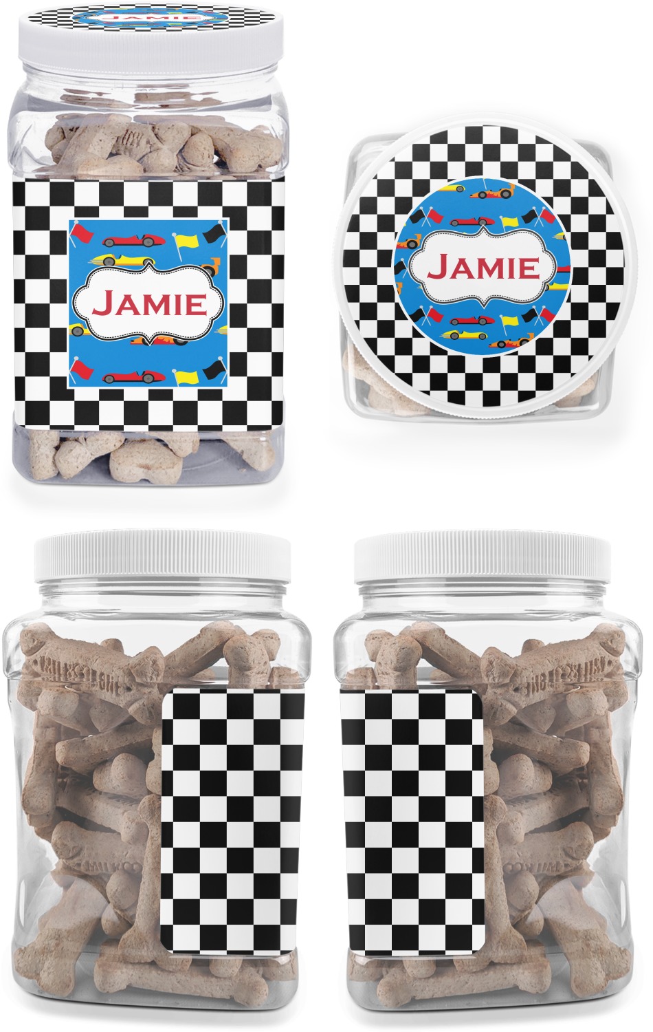 This half gallon jar, made from a sturdy plastic, is the perfect way to keep treats from any naughty pet paws, while still keeping them ready on hand for when your pup performs an impressive trick. This dog cookie jar features a screw-on, white lid that displays your personalized design on a vinyl sticker. We apply another customized sticker that wraps around the front and sides of the jar. Our dog treat jar also has indentations on the rear ends of the sides, which allows for convenient handling, and its square frame allows for easy storage.