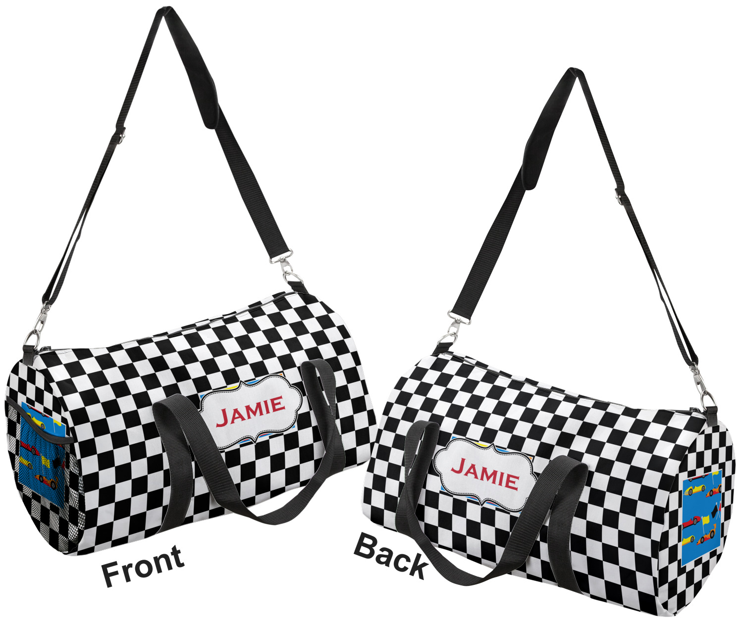 This duffle is a sturdy bag made of a canvas material. It comes in two sizes: Small (19"W x 9.5"H x 9.5"D) and Large (23"W x 12"H x 12"D). The bag is a cylindrical shape with a black adjustable strap and two handles. On one side is an elastic pouch to put a waterbottle or other small item. Your product will be sublimated with your design and is able to be designed on the front, back, and sides. Be sure to remember that the straps may cut into parts of your design if you upload your own artwork.