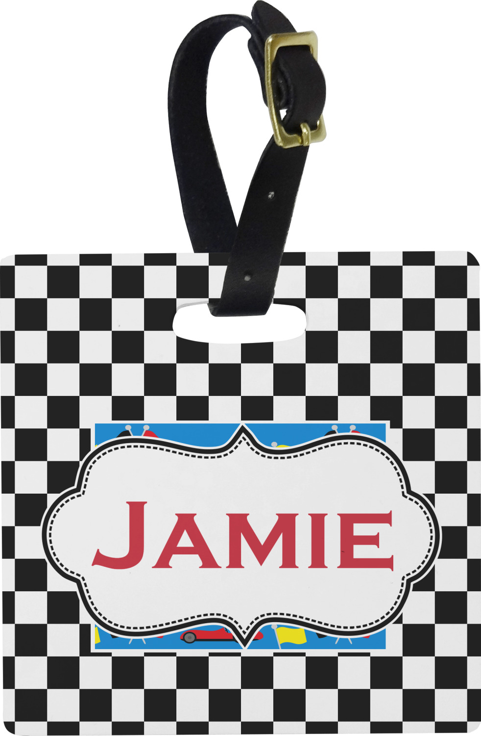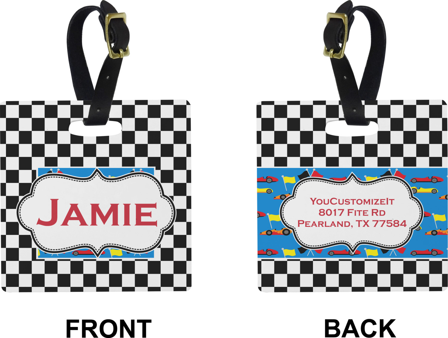 These personalized bag tags are sold in a variety of shapes, so that you may find the product that meets your vision exactly. We sell a round luggage tag, which measures at approximately 4" x 4". Our square luggage tag is about 3.5" x 3.5", while our rectangular version is 2.75" x 4 ".