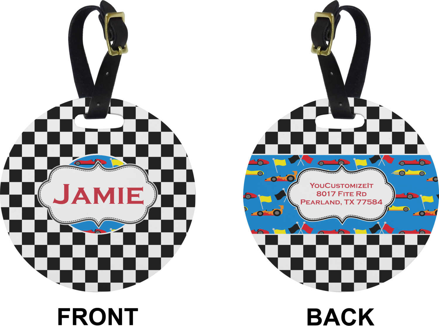 These cute luggage tags are made of a fiber-reinforced, UV-resistant plastic, making them waterproof and durable enough for both everyday use and the rugged adventures of any traveler! A leather strap with holes and a buckle is included with your purchase and can be used to attach your custom luggage tag to any suitcase, backpack, or duffel bag. You can design these travel tags as you wish; your customization will be displayed across the front, while the back will show as little or as much personal information as you want.