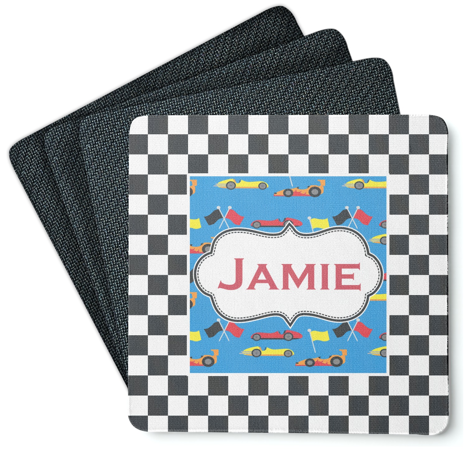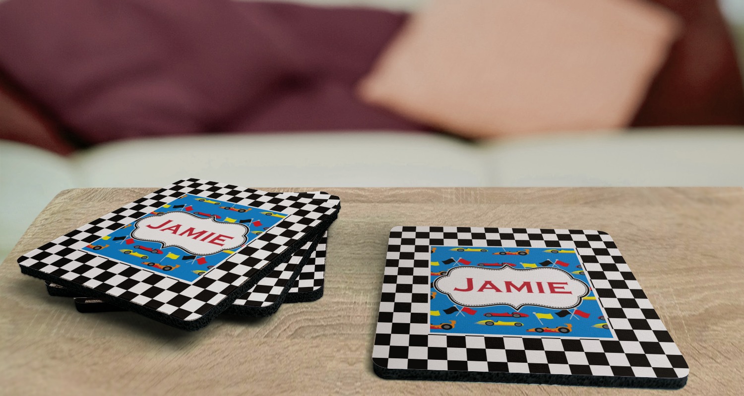 These drink coasters have a smooth, polyester top and a textured, rubber backing on its bottom. The non-slip rubber backing underneath works to keep any spills at bay. At 4 by 4 by 0.25 inches thick, these custom coasters are a suitable size for most drinkware. Your personalization is displayed atop the face of the cup coaster. We sell these rubber coasters in two different shapes: square and round. You can buy each shape as singulars or as a set of 4.
