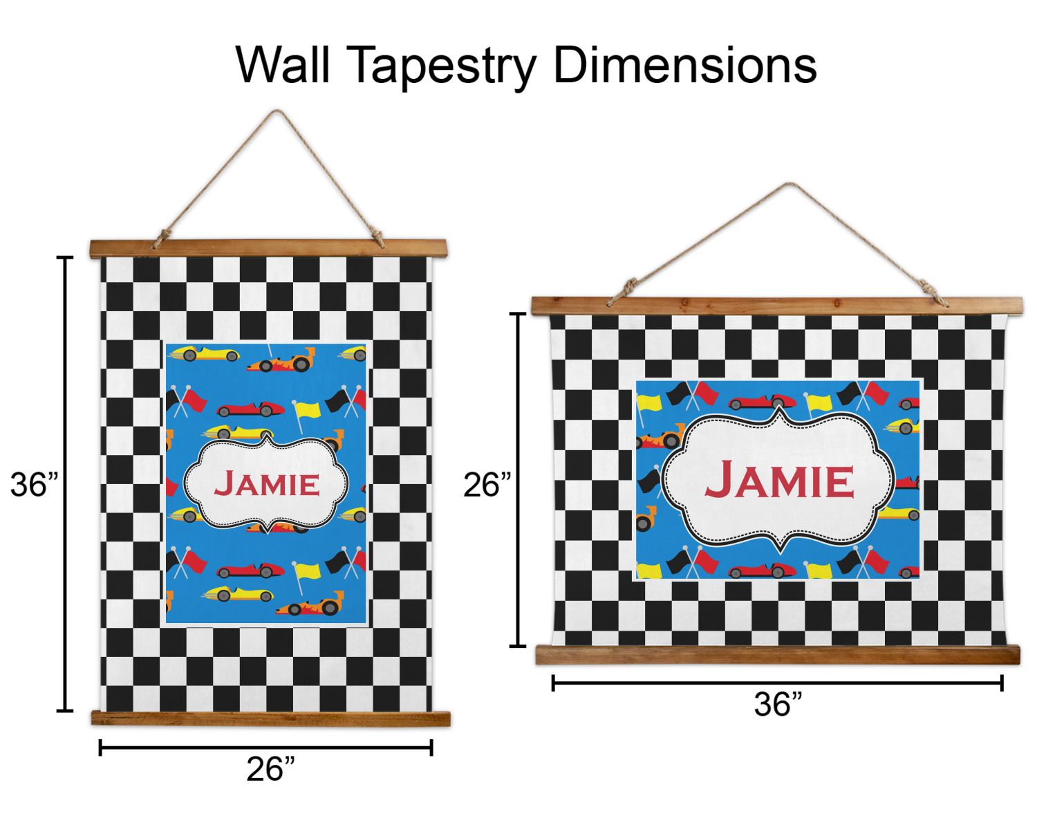Made in two different orientations - portrait or landscape - both are 26" x 36". Your design is printed on a high quality polyester fabric with hemmed edges. The wood on the top and bottom of the tapestry is 1.25" tall and 0.25" thick and there are two pieces on top and bottom which sandwich the fabric.
