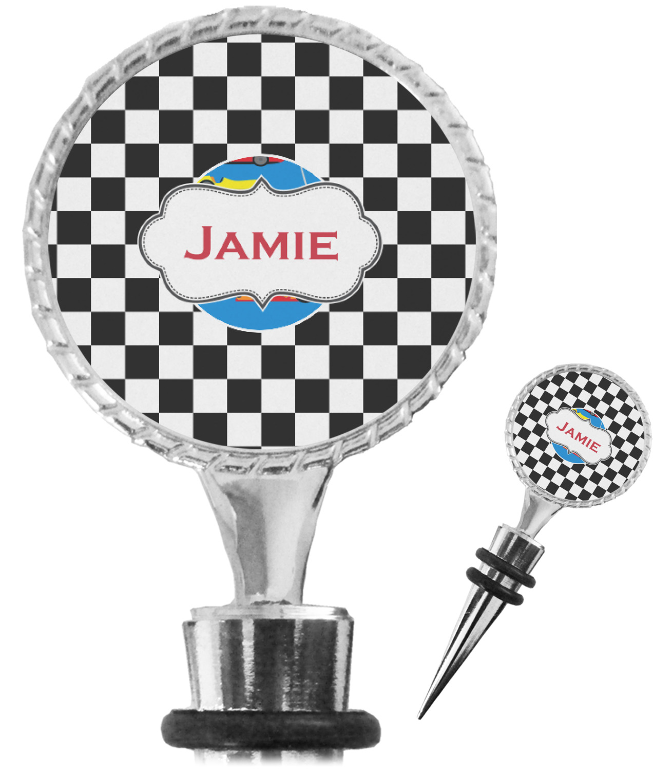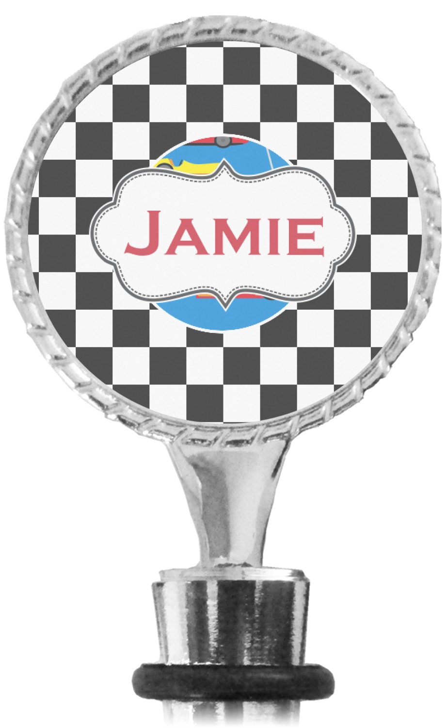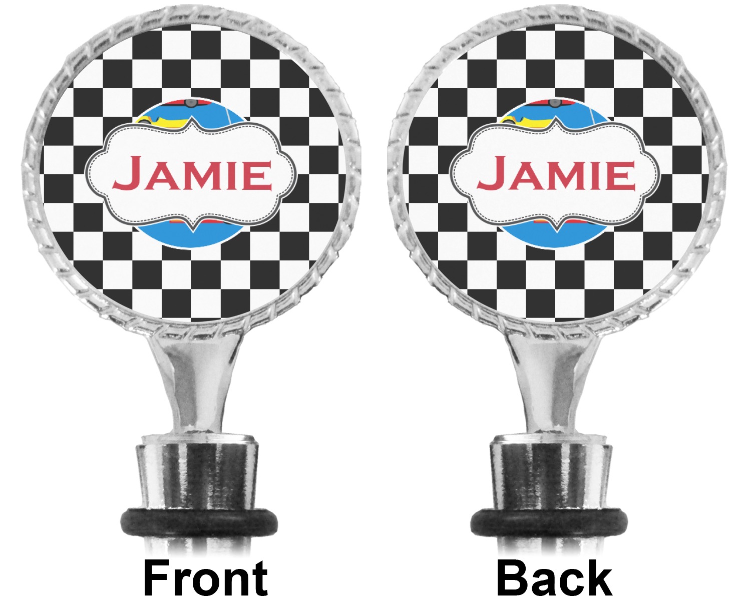 The top part of your bottle stopper is comprised of a zinc ring that displays your customization(s) in its middle, on both sides. The ring is heavy duty, with a bright chrome finish. The body of the wine stoppers have two silicone rings to provide an airtight seal. These wine bottle stoppers measure at 1.625" L x 0.8125" W x 4.625" H; your custom wine stopper is meant to fit into most standard-sized wine bottles.