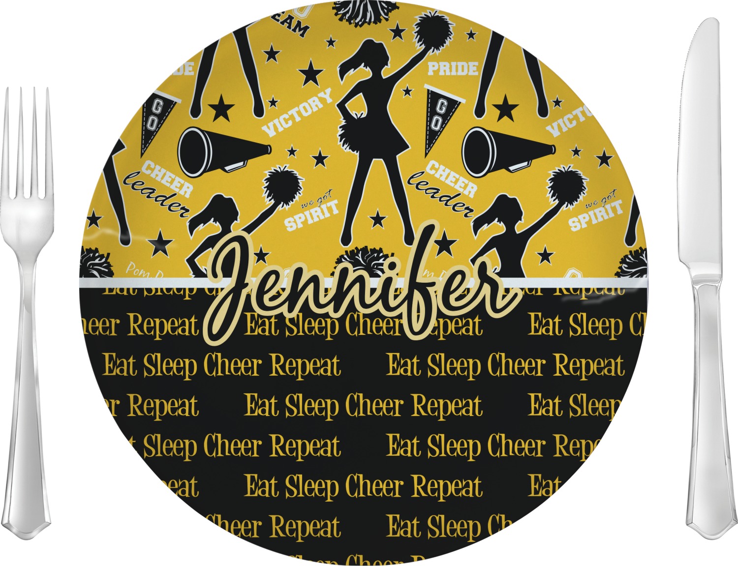 This design is a fun combo with a bright yellow and black. The two colors are a great contrast to one another. The top half of the design has a cheerleader sillhouette as well as words like "cheerleader" and "victory." The bottom half has a background that says eat, sleep, cheer, repeat. Your personalization goes right in between these two backgrounds right in the middle.