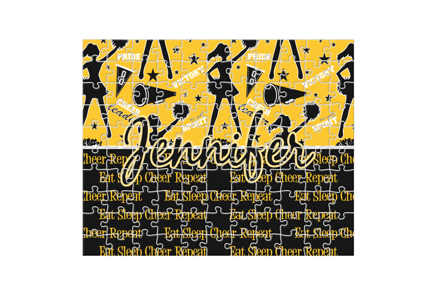 This design is a fun combo with a bright yellow and black. The two colors are a great contrast to one another. The top half of the design has a cheerleader sillhouette as well as words like "cheerleader" and "victory." The bottom half has a background that says eat, sleep, cheer, repeat. Your personalization goes right in between these two backgrounds right in the middle.