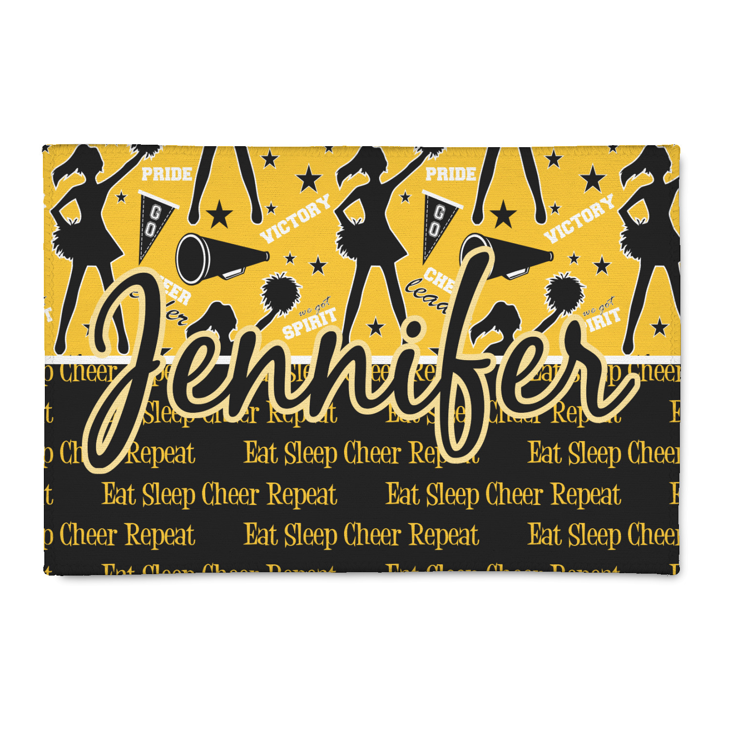 This design is a fun combo with a bright yellow and black. The two colors are a great contrast to one another. The top half of the design has a cheerleader sillhouette as well as words like "cheerleader" and "victory." The bottom half has a background that says eat, sleep, cheer, repeat. Your personalization goes right in between these two backgrounds right in the middle.