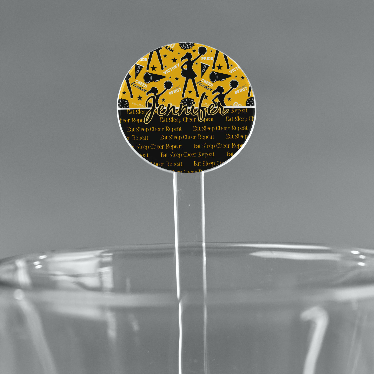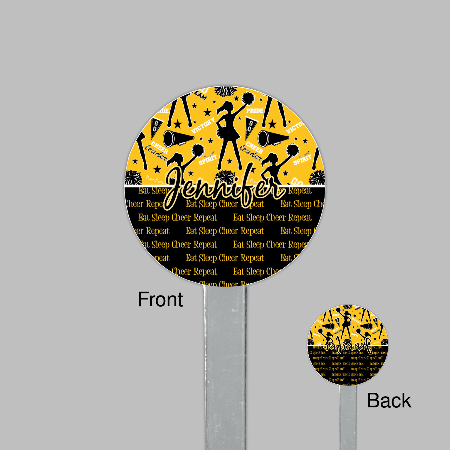 This design is a fun combo with a bright yellow and black. The two colors are a great contrast to one another. The top half of the design has a cheerleader sillhouette as well as words like "cheerleader" and "victory." The bottom half has a background that says eat, sleep, cheer, repeat. Your personalization goes right in between these two backgrounds right in the middle.