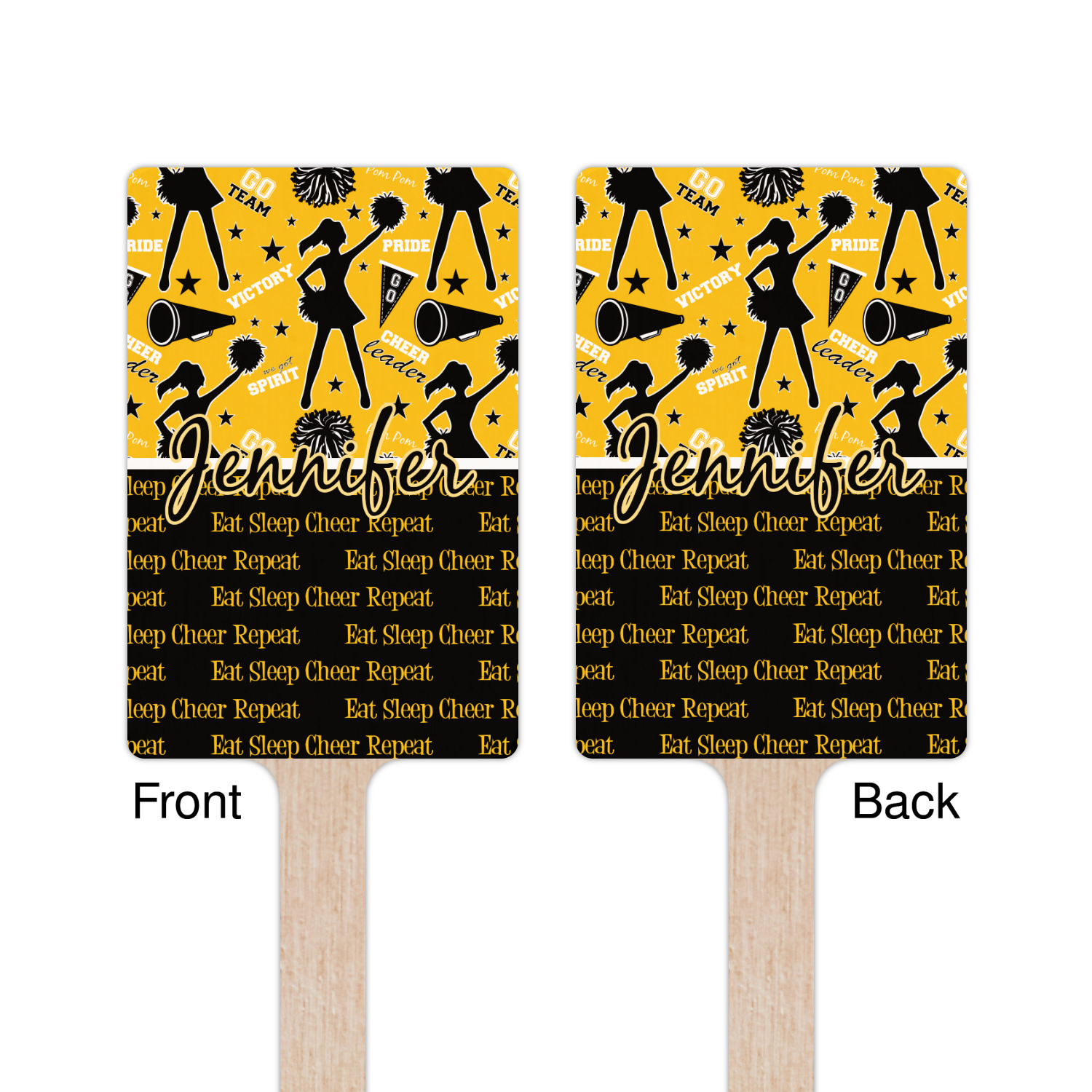 This design is a fun combo with a bright yellow and black. The two colors are a great contrast to one another. The top half of the design has a cheerleader sillhouette as well as words like "cheerleader" and "victory." The bottom half has a background that says eat, sleep, cheer, repeat. Your personalization goes right in between these two backgrounds right in the middle.