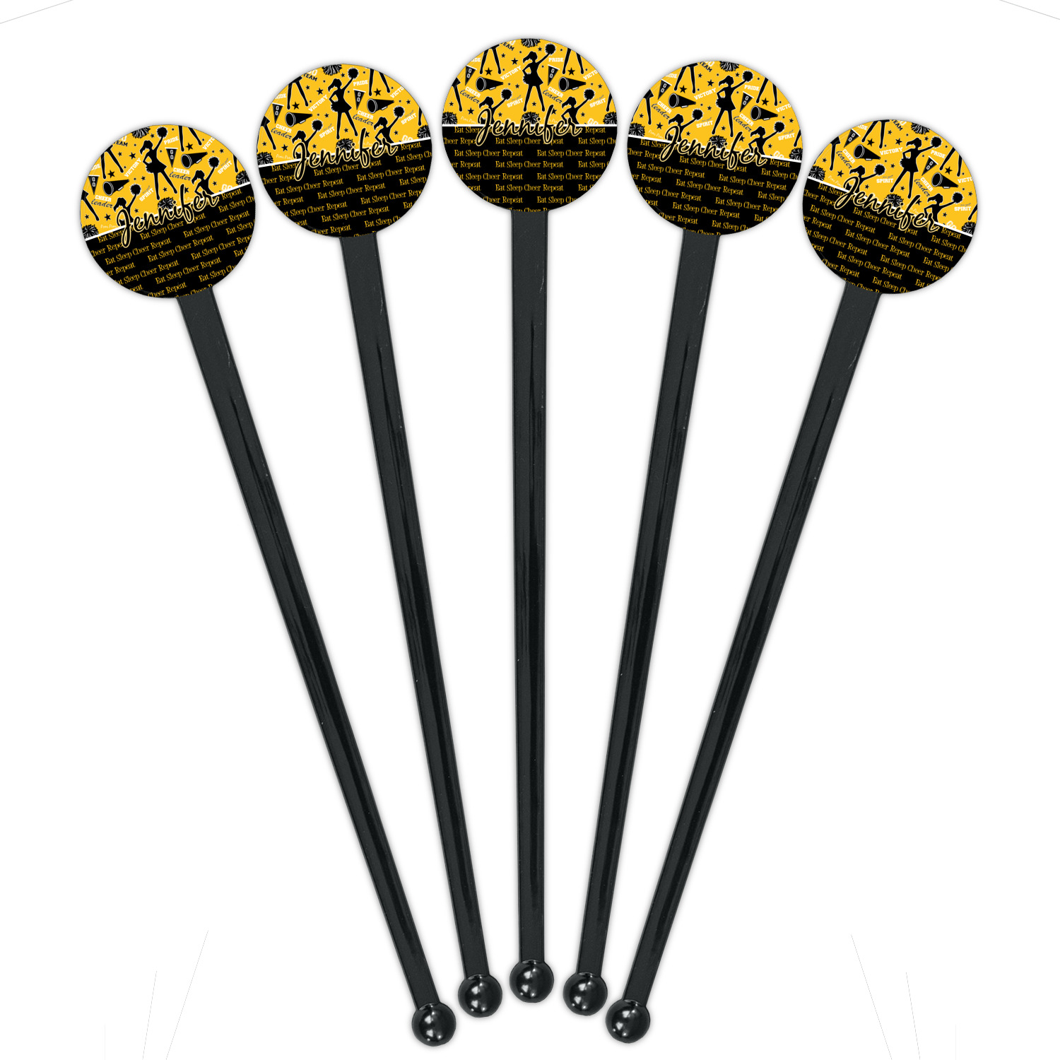 This design is a fun combo with a bright yellow and black. The two colors are a great contrast to one another. The top half of the design has a cheerleader sillhouette as well as words like "cheerleader" and "victory." The bottom half has a background that says eat, sleep, cheer, repeat. Your personalization goes right in between these two backgrounds right in the middle.