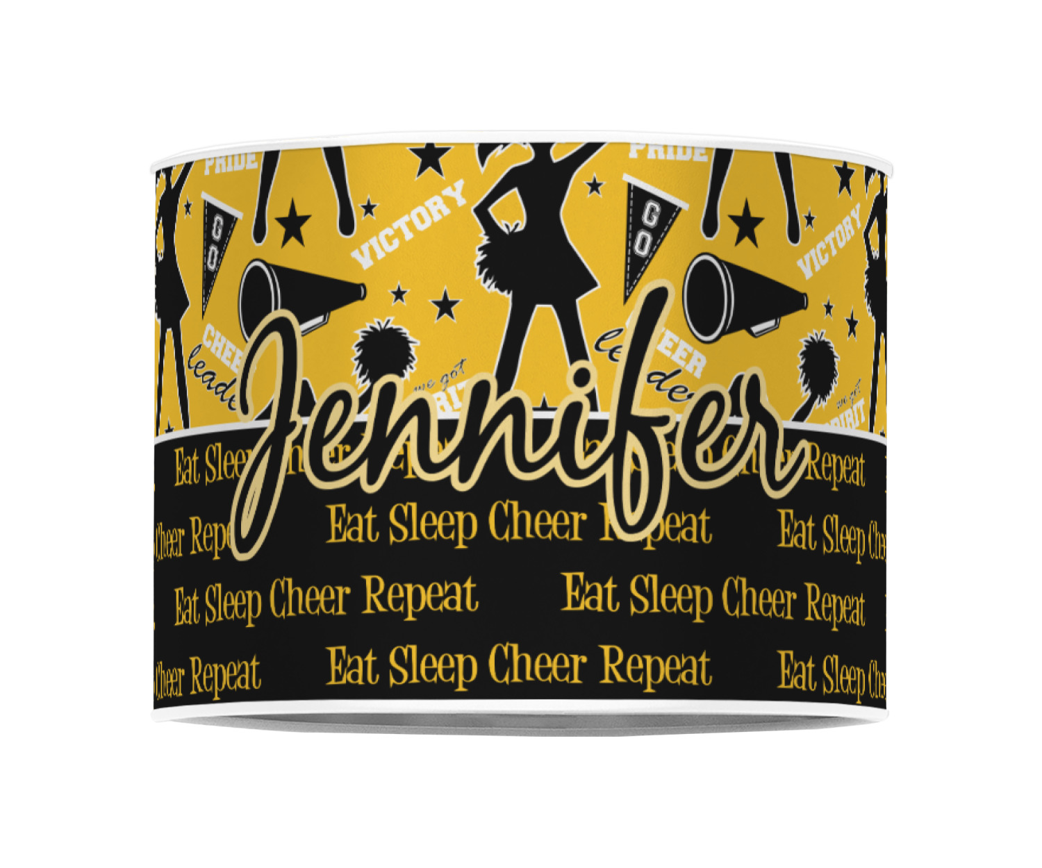 This design is a fun combo with a bright yellow and black. The two colors are a great contrast to one another. The top half of the design has a cheerleader sillhouette as well as words like "cheerleader" and "victory." The bottom half has a background that says eat, sleep, cheer, repeat. Your personalization goes right in between these two backgrounds right in the middle.