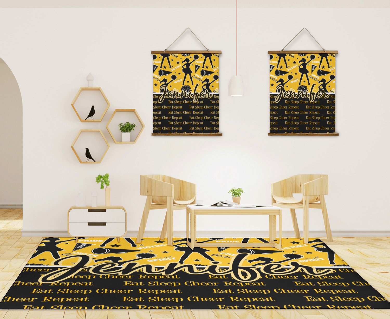 This design is a fun combo with a bright yellow and black. The two colors are a great contrast to one another. The top half of the design has a cheerleader sillhouette as well as words like "cheerleader" and "victory." The bottom half has a background that says eat, sleep, cheer, repeat. Your personalization goes right in between these two backgrounds right in the middle.