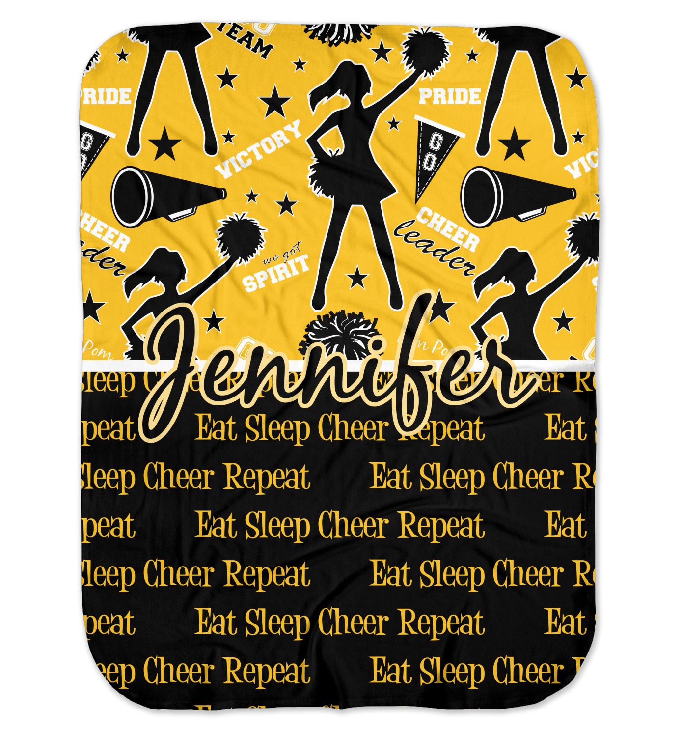 This design is a fun combo with a bright yellow and black. The two colors are a great contrast to one another. The top half of the design has a cheerleader sillhouette as well as words like "cheerleader" and "victory." The bottom half has a background that says eat, sleep, cheer, repeat. Your personalization goes right in between these two backgrounds right in the middle.