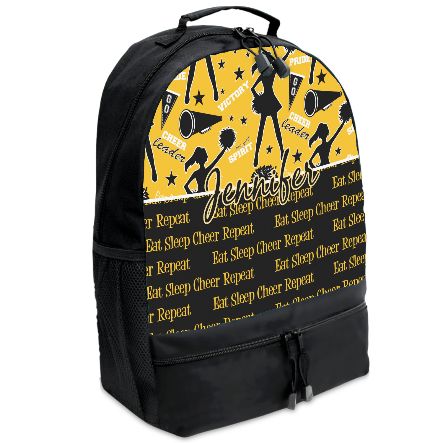 This design is a fun combo with a bright yellow and black. The two colors are a great contrast to one another. The top half of the design has a cheerleader sillhouette as well as words like "cheerleader" and "victory." The bottom half has a background that says eat, sleep, cheer, repeat. Your personalization goes right in between these two backgrounds right in the middle.