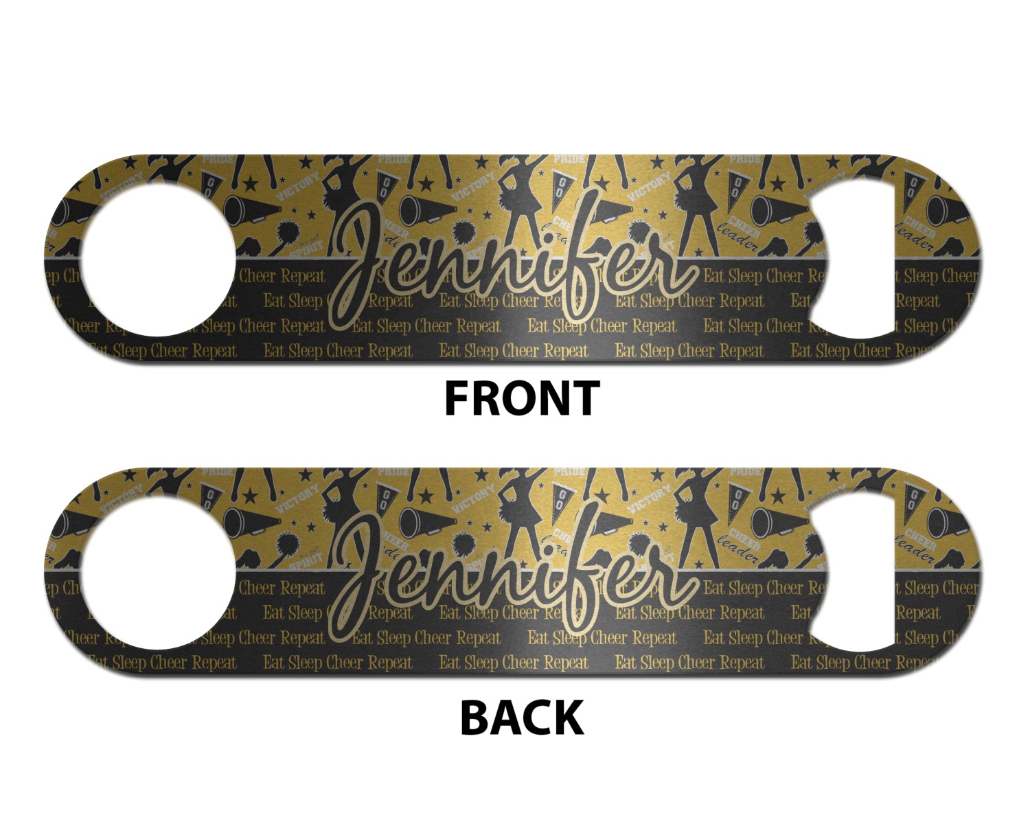This design is a fun combo with a bright yellow and black. The two colors are a great contrast to one another. The top half of the design has a cheerleader sillhouette as well as words like "cheerleader" and "victory." The bottom half has a background that says eat, sleep, cheer, repeat. Your personalization goes right in between these two backgrounds right in the middle.