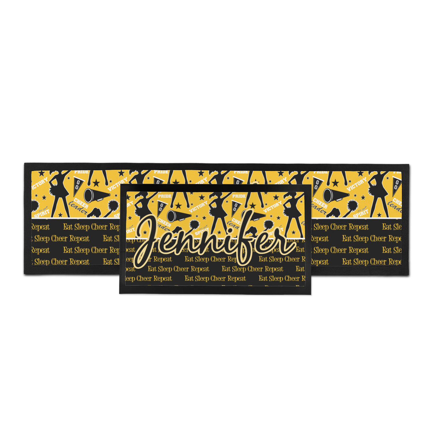 This design is a fun combo with a bright yellow and black. The two colors are a great contrast to one another. The top half of the design has a cheerleader sillhouette as well as words like "cheerleader" and "victory." The bottom half has a background that says eat, sleep, cheer, repeat. Your personalization goes right in between these two backgrounds right in the middle.
