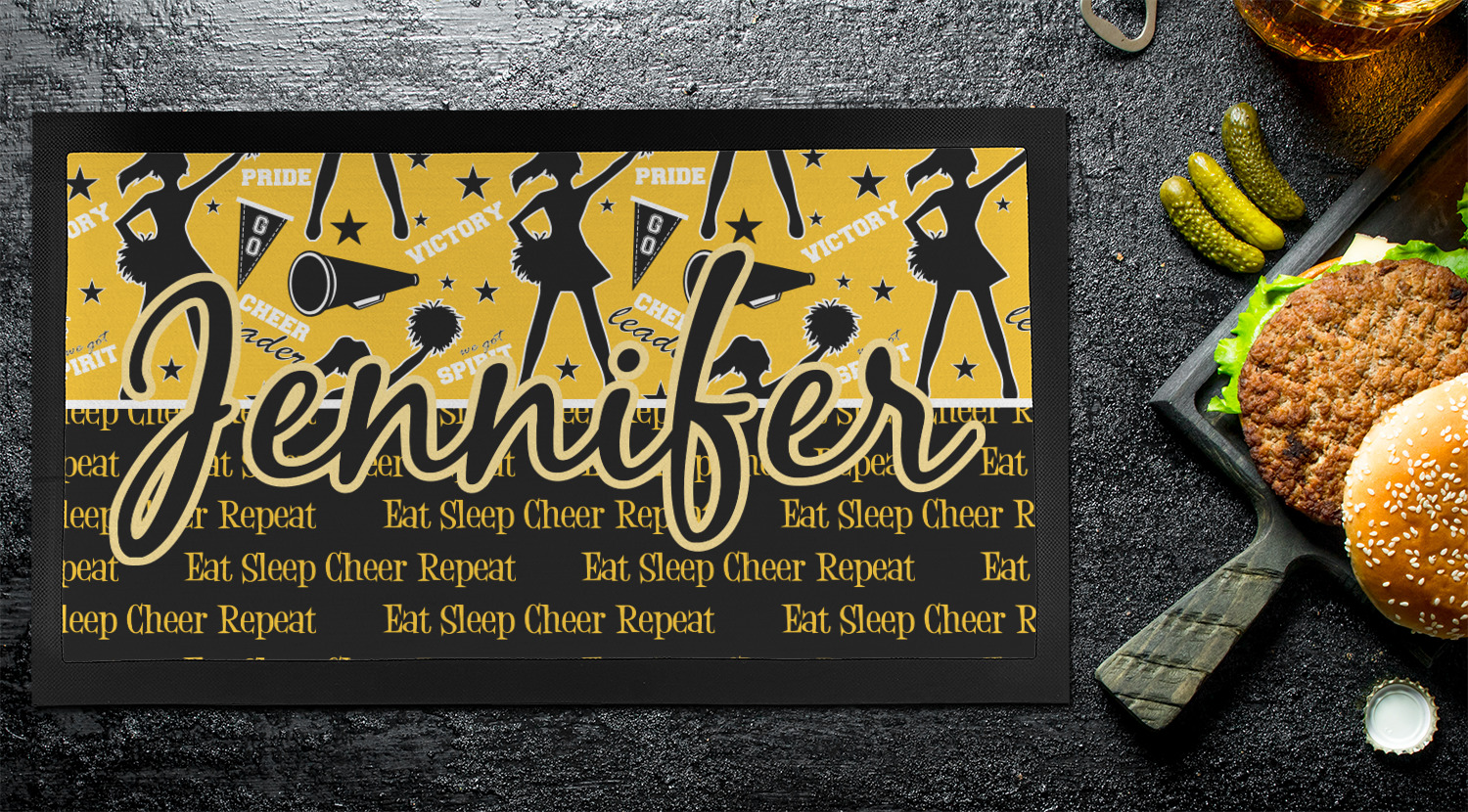 This design is a fun combo with a bright yellow and black. The two colors are a great contrast to one another. The top half of the design has a cheerleader sillhouette as well as words like "cheerleader" and "victory." The bottom half has a background that says eat, sleep, cheer, repeat. Your personalization goes right in between these two backgrounds right in the middle.
