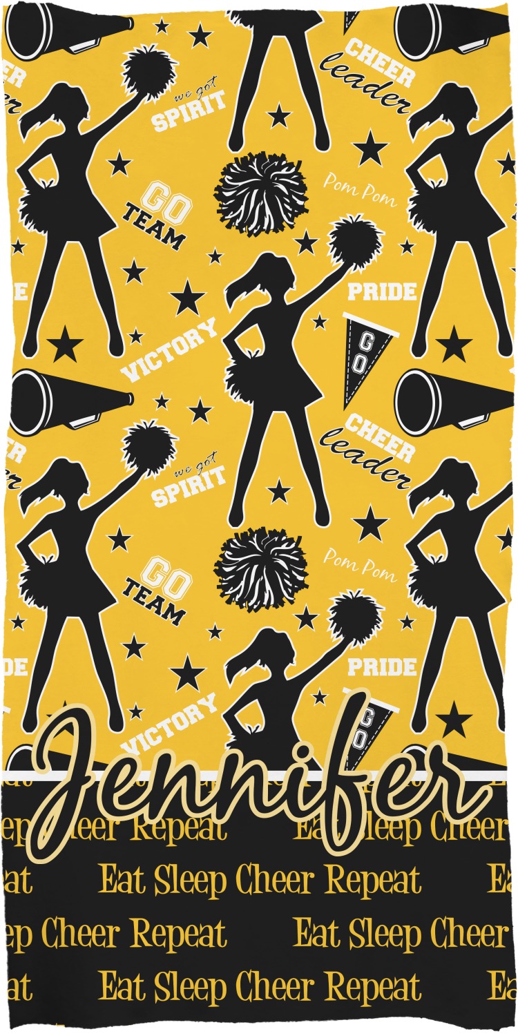 This design is a fun combo with a bright yellow and black. The two colors are a great contrast to one another. The top half of the design has a cheerleader sillhouette as well as words like "cheerleader" and "victory." The bottom half has a background that says eat, sleep, cheer, repeat. Your personalization goes right in between these two backgrounds right in the middle.