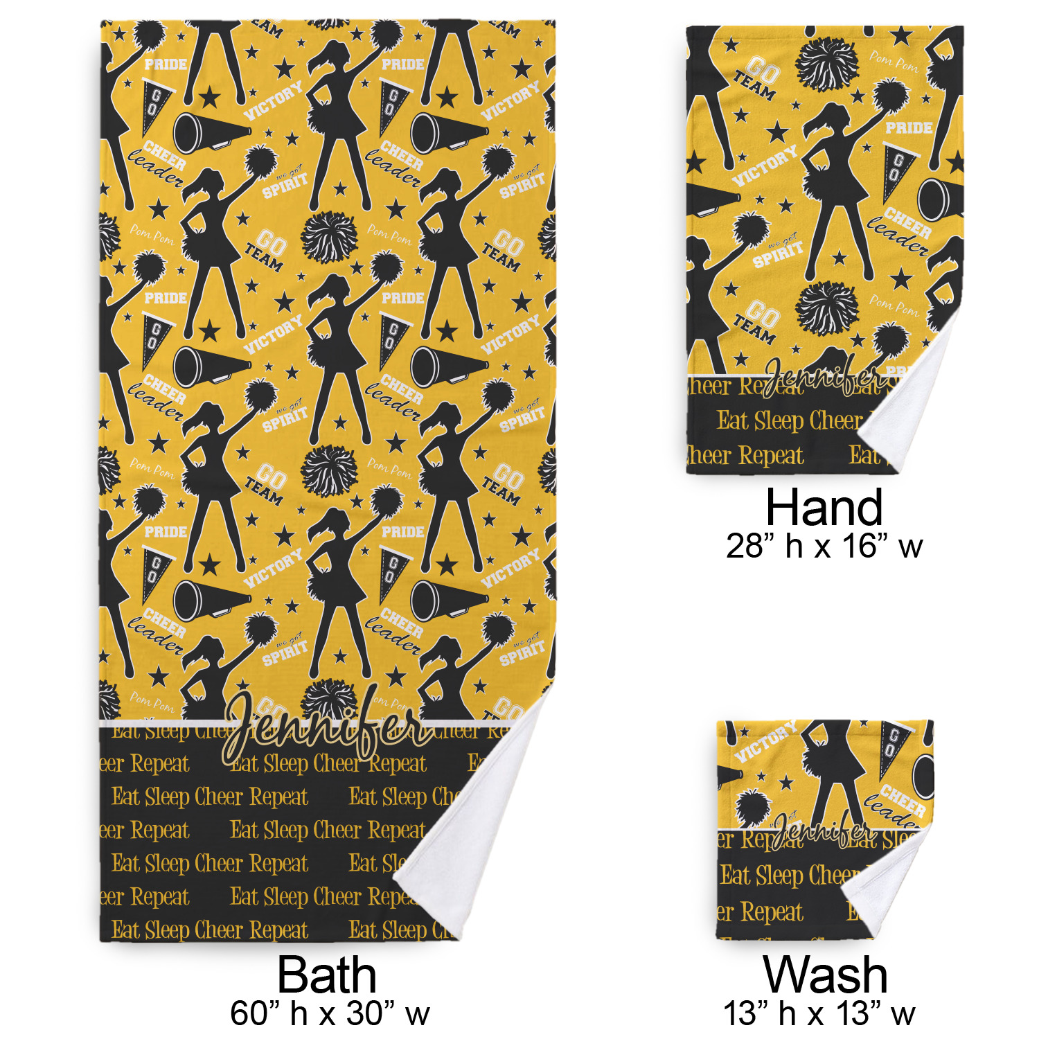 This design is a fun combo with a bright yellow and black. The two colors are a great contrast to one another. The top half of the design has a cheerleader sillhouette as well as words like "cheerleader" and "victory." The bottom half has a background that says eat, sleep, cheer, repeat. Your personalization goes right in between these two backgrounds right in the middle.