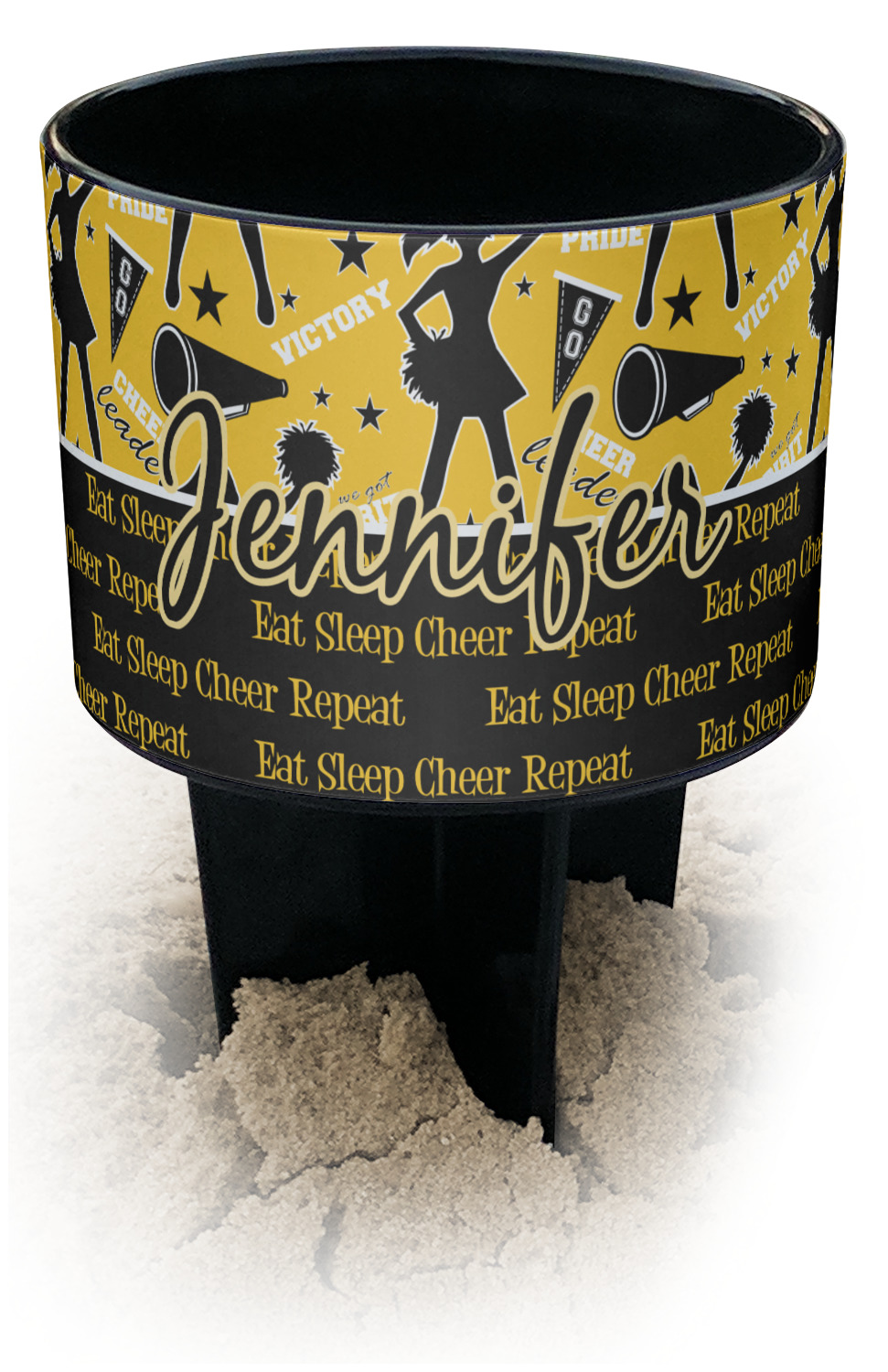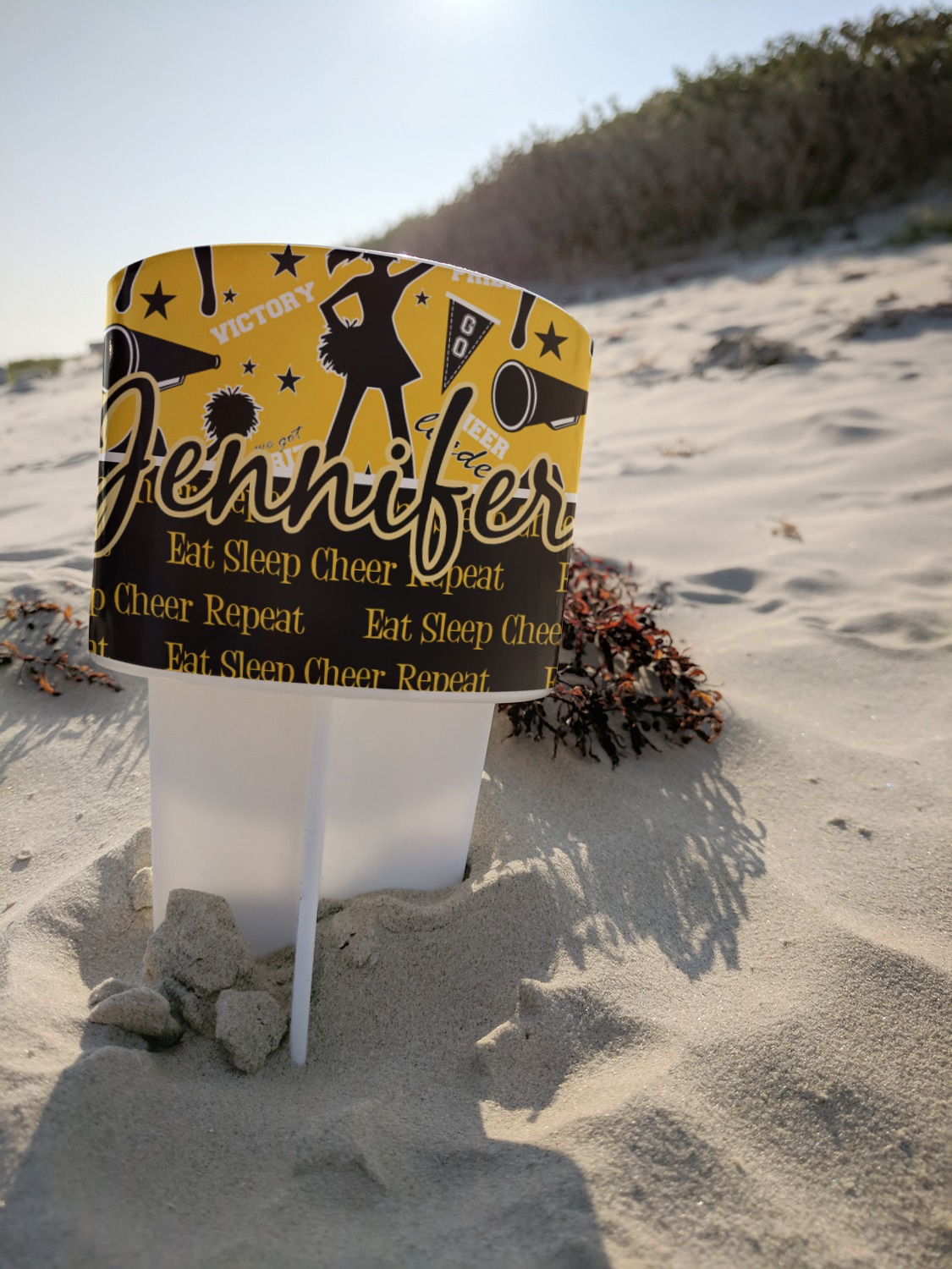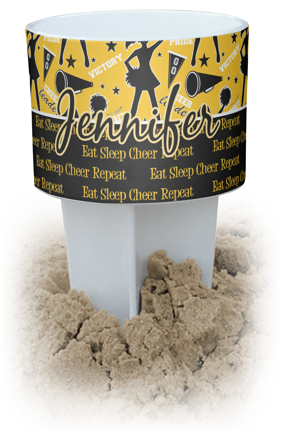 This cup holder has a large stake at its bottom that anchors it to the sand or ground below, while the cup holder rests above the stake. The entire drink holder is made of durable plastic and displays your customization around the cup holder portion. We sell these personalized beach spikers in two different colors: black and white.