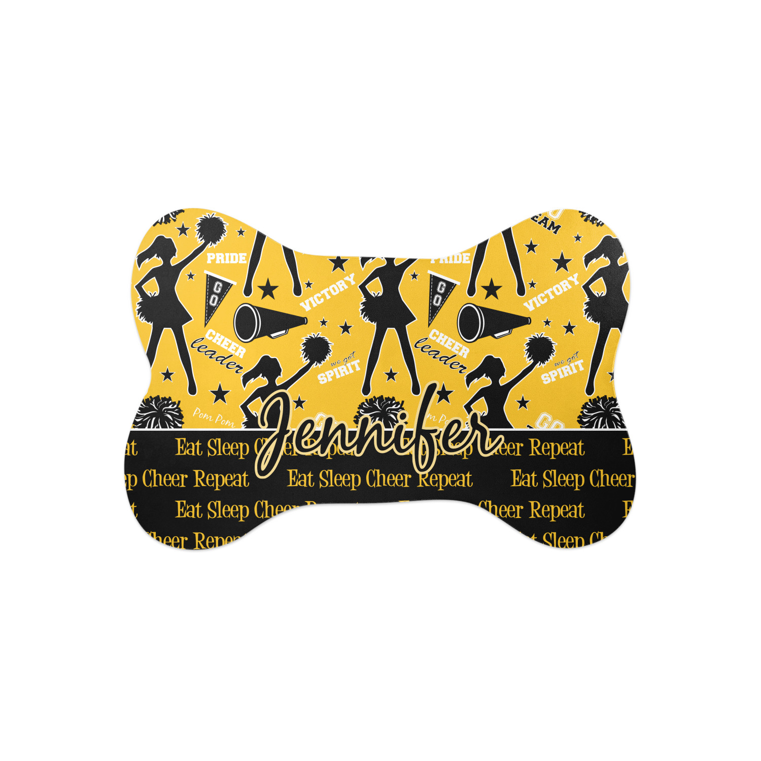 This design is a fun combo with a bright yellow and black. The two colors are a great contrast to one another. The top half of the design has a cheerleader sillhouette as well as words like "cheerleader" and "victory." The bottom half has a background that says eat, sleep, cheer, repeat. Your personalization goes right in between these two backgrounds right in the middle.