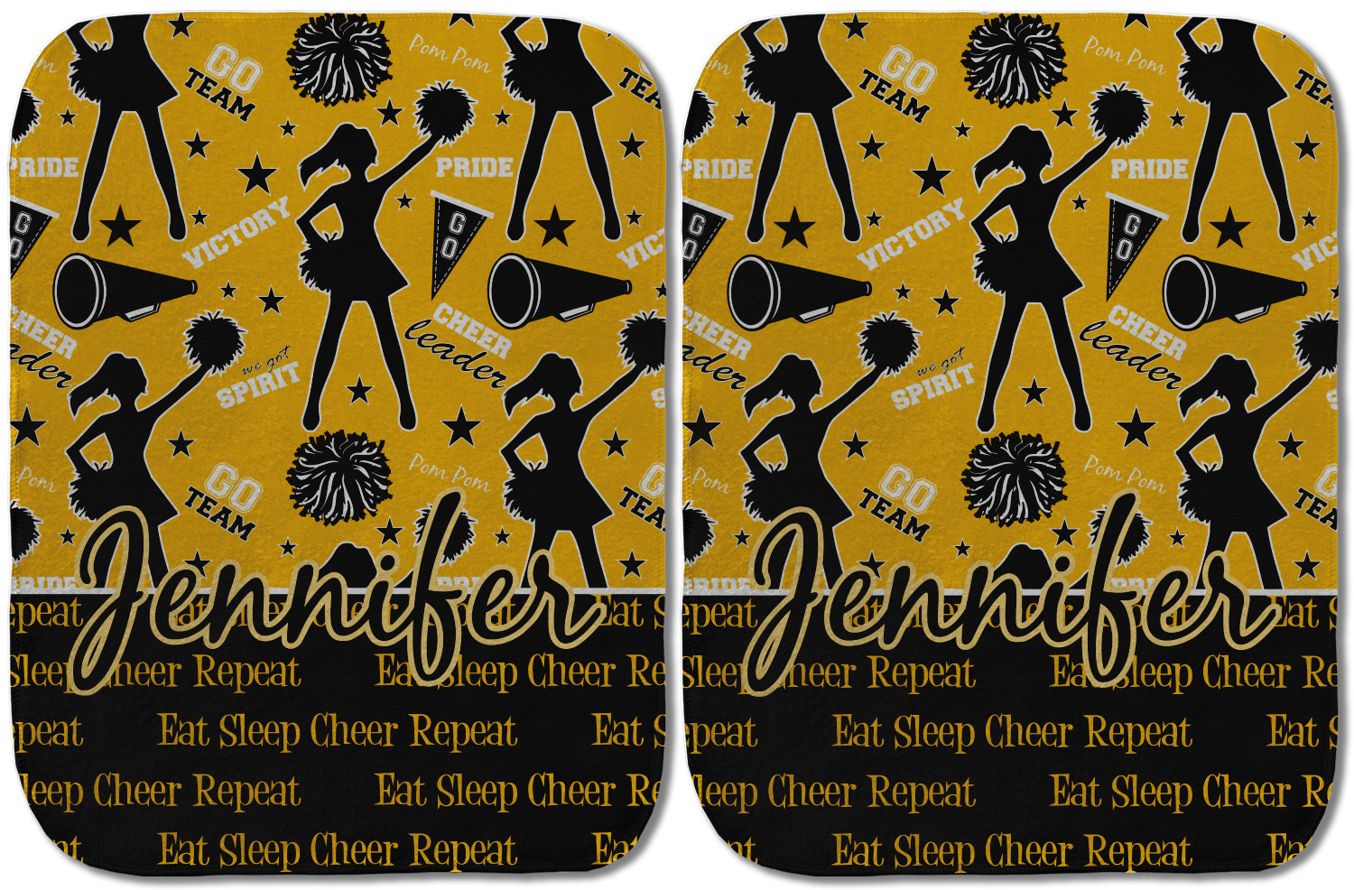 This design is a fun combo with a bright yellow and black. The two colors are a great contrast to one another. The top half of the design has a cheerleader sillhouette as well as words like "cheerleader" and "victory." The bottom half has a background that says eat, sleep, cheer, repeat. Your personalization goes right in between these two backgrounds right in the middle.