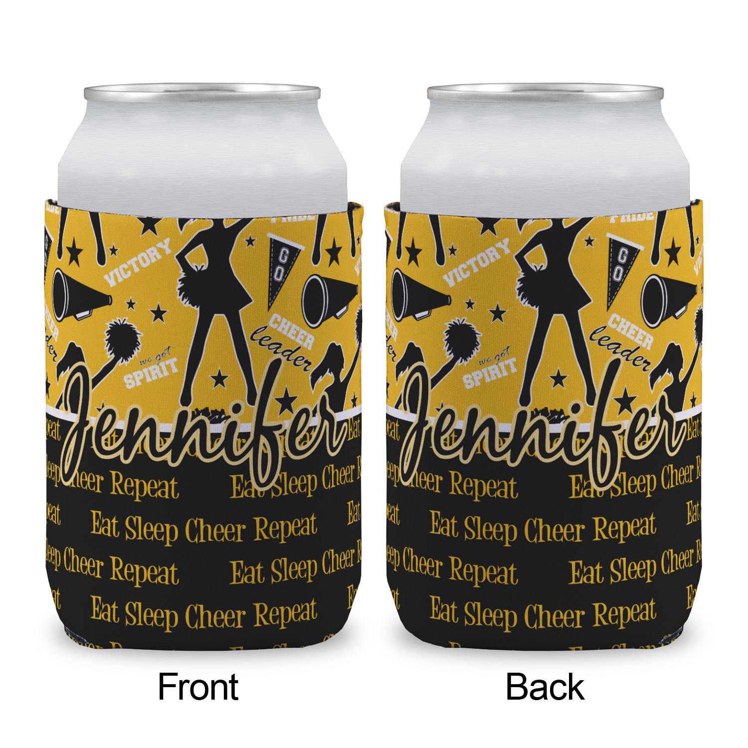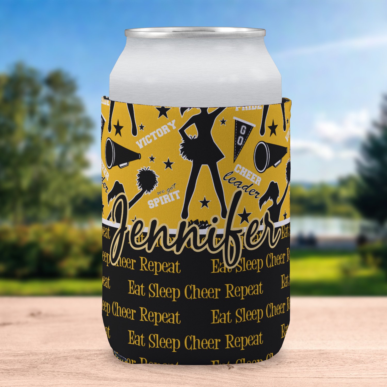 This design is a fun combo with a bright yellow and black. The two colors are a great contrast to one another. The top half of the design has a cheerleader sillhouette as well as words like "cheerleader" and "victory." The bottom half has a background that says eat, sleep, cheer, repeat. Your personalization goes right in between these two backgrounds right in the middle.