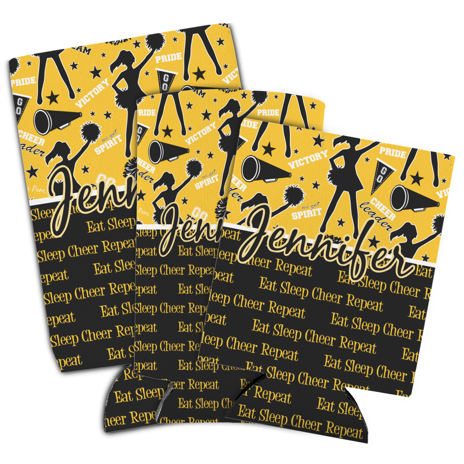 This design is a fun combo with a bright yellow and black. The two colors are a great contrast to one another. The top half of the design has a cheerleader sillhouette as well as words like "cheerleader" and "victory." The bottom half has a background that says eat, sleep, cheer, repeat. Your personalization goes right in between these two backgrounds right in the middle.