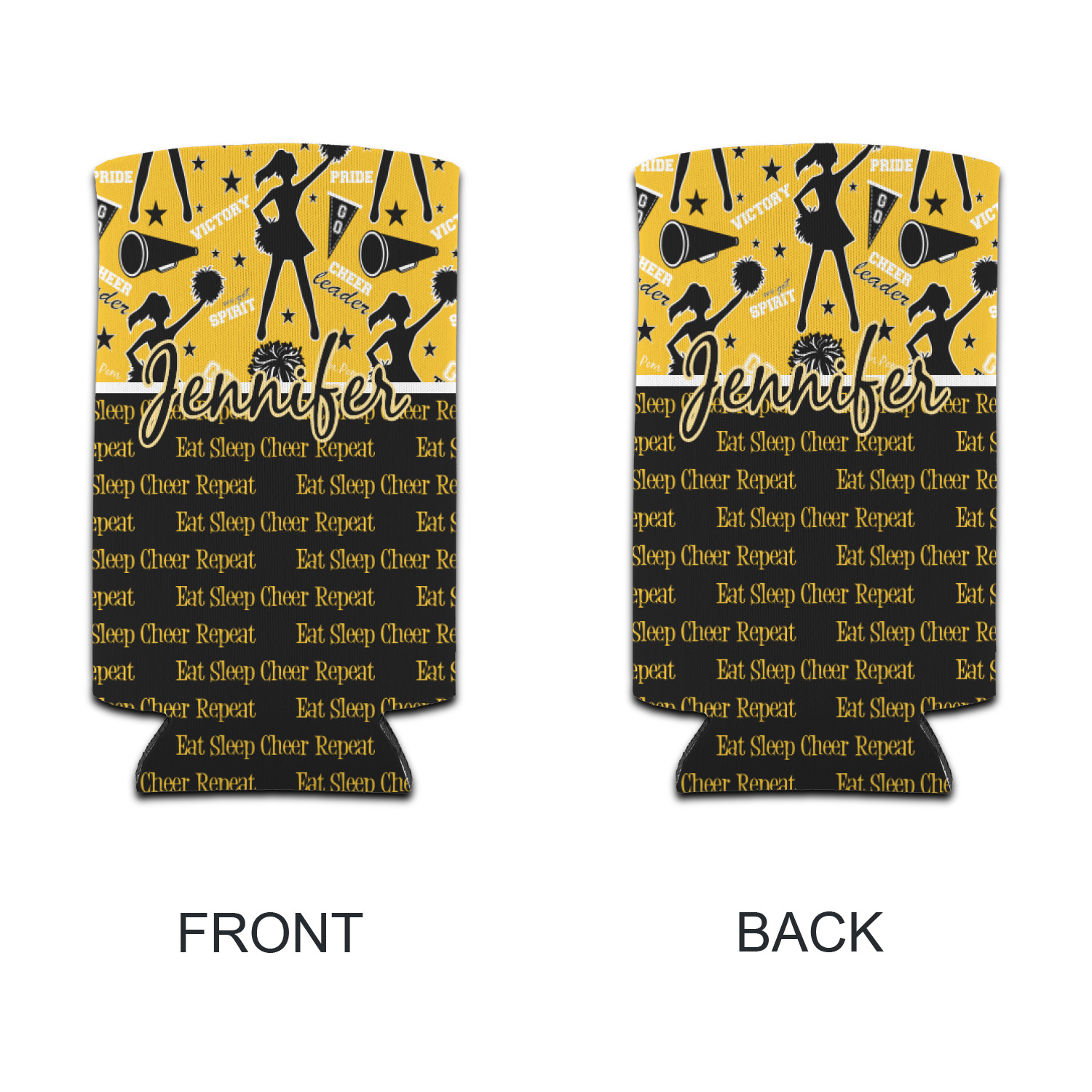 This design is a fun combo with a bright yellow and black. The two colors are a great contrast to one another. The top half of the design has a cheerleader sillhouette as well as words like "cheerleader" and "victory." The bottom half has a background that says eat, sleep, cheer, repeat. Your personalization goes right in between these two backgrounds right in the middle.