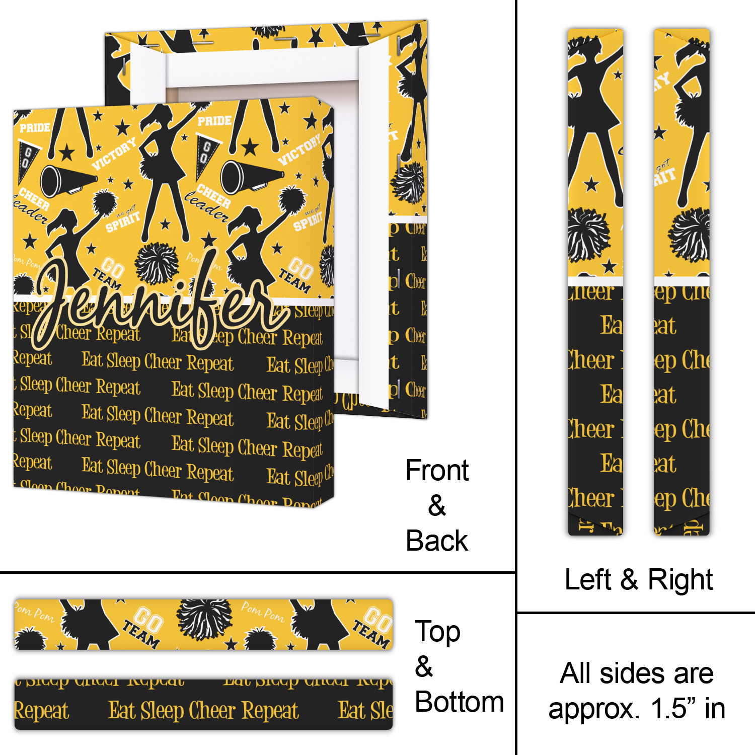 This design is a fun combo with a bright yellow and black. The two colors are a great contrast to one another. The top half of the design has a cheerleader sillhouette as well as words like "cheerleader" and "victory." The bottom half has a background that says eat, sleep, cheer, repeat. Your personalization goes right in between these two backgrounds right in the middle.