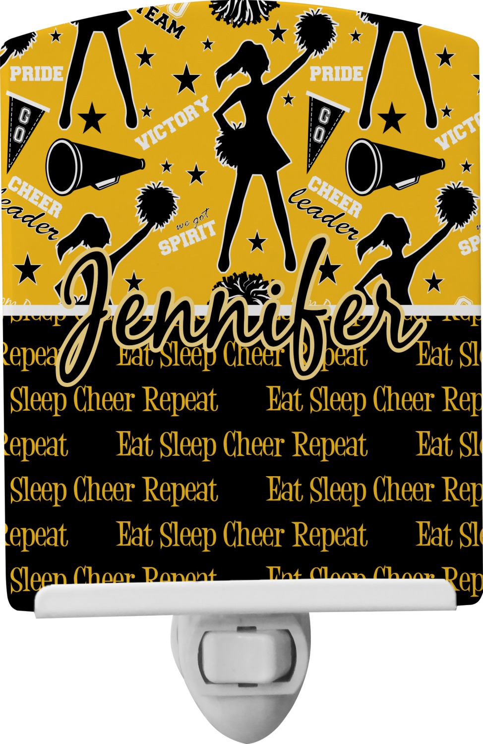 This design is a fun combo with a bright yellow and black. The two colors are a great contrast to one another. The top half of the design has a cheerleader sillhouette as well as words like "cheerleader" and "victory." The bottom half has a background that says eat, sleep, cheer, repeat. Your personalization goes right in between these two backgrounds right in the middle.