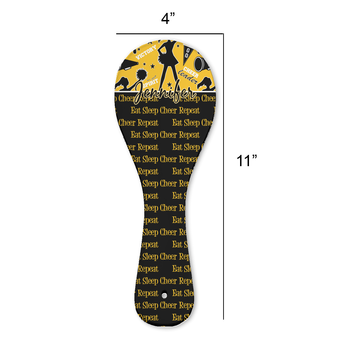 This design is a fun combo with a bright yellow and black. The two colors are a great contrast to one another. The top half of the design has a cheerleader sillhouette as well as words like "cheerleader" and "victory." The bottom half has a background that says eat, sleep, cheer, repeat. Your personalization goes right in between these two backgrounds right in the middle.