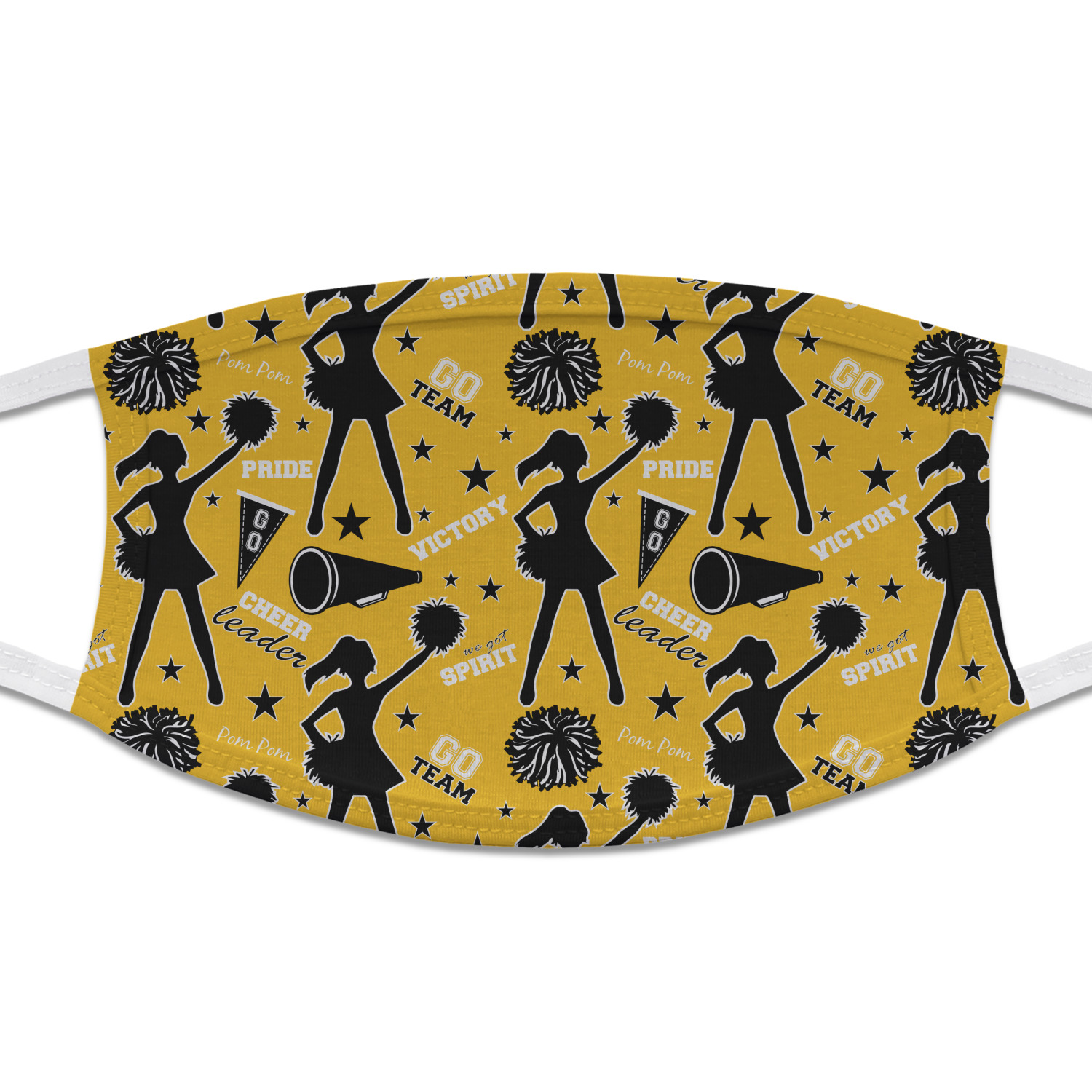 This design is a fun combo with a bright yellow and black. The two colors are a great contrast to one another. The top half of the design has a cheerleader sillhouette as well as words like "cheerleader" and "victory." The bottom half has a background that says eat, sleep, cheer, repeat. Your personalization goes right in between these two backgrounds right in the middle.
