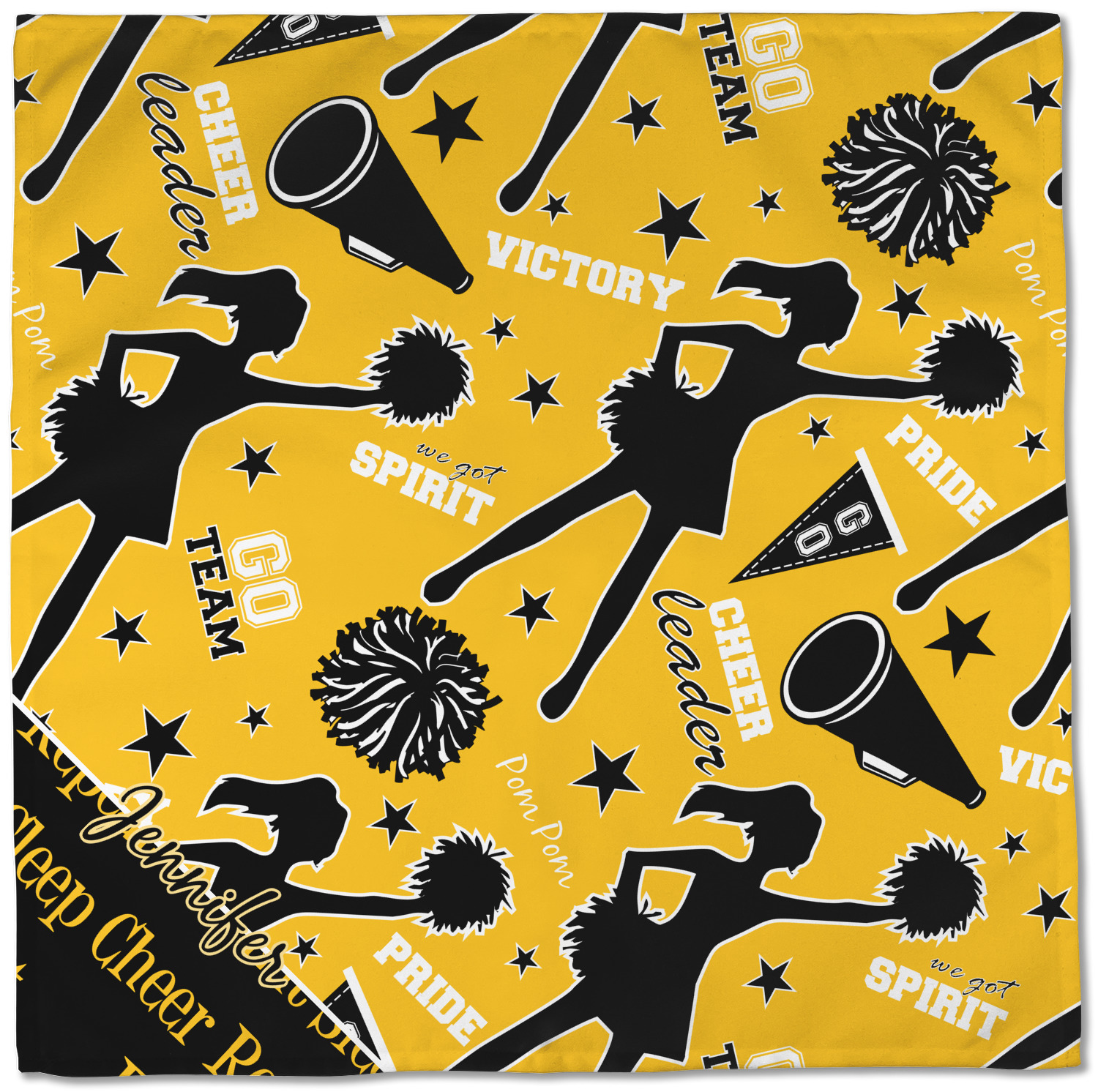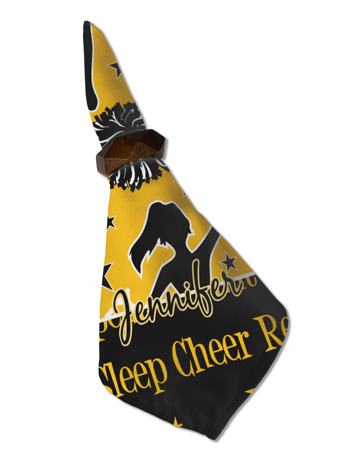 This design is a fun combo with a bright yellow and black. The two colors are a great contrast to one another. The top half of the design has a cheerleader sillhouette as well as words like "cheerleader" and "victory." The bottom half has a background that says eat, sleep, cheer, repeat. Your personalization goes right in between these two backgrounds right in the middle.