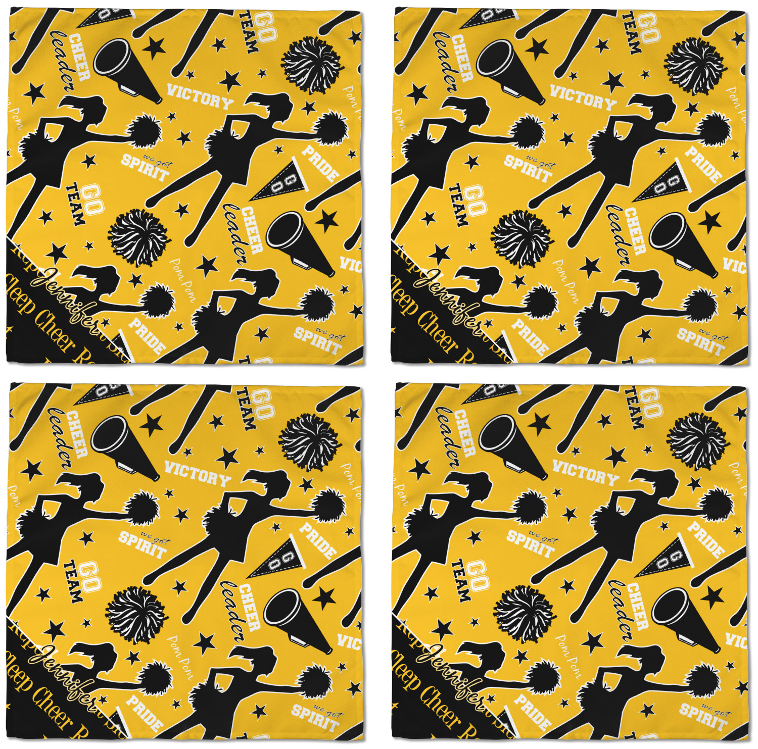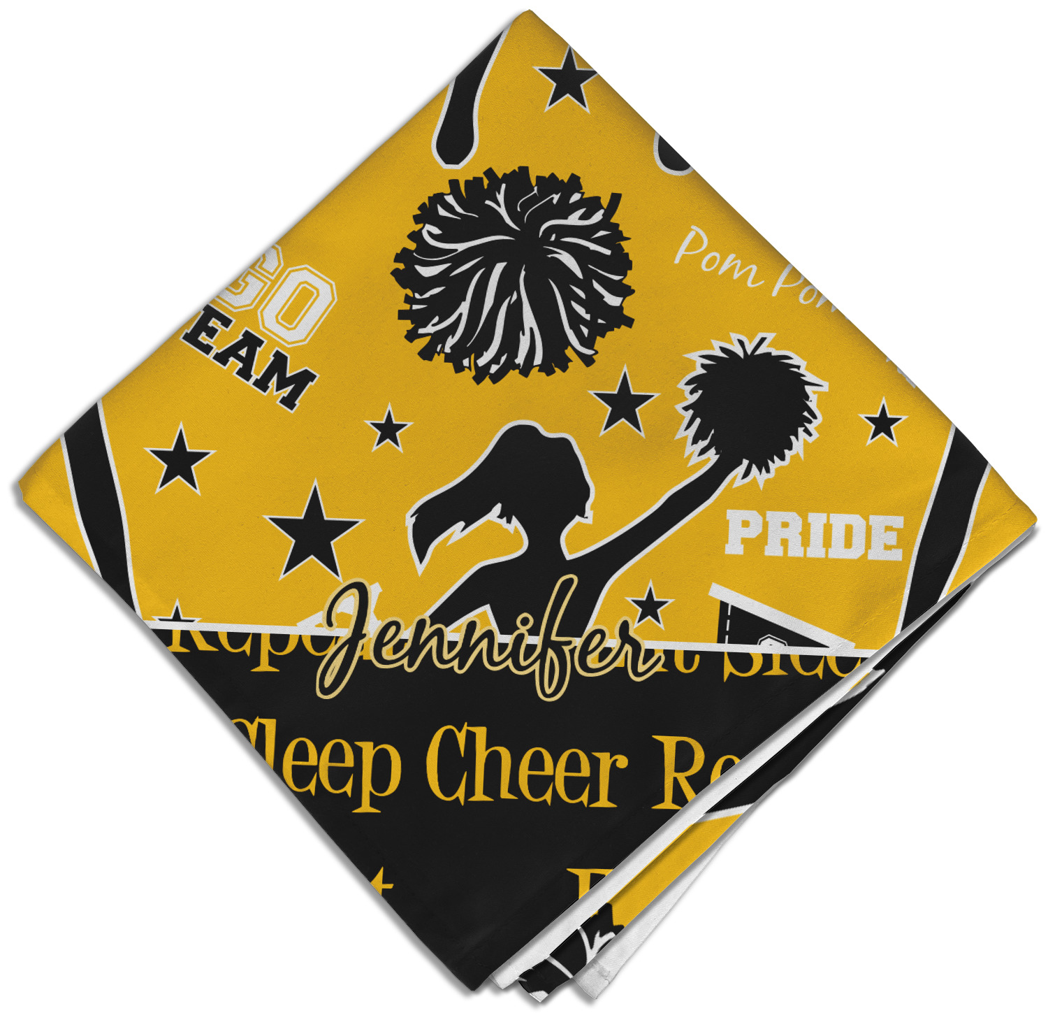 This design is a fun combo with a bright yellow and black. The two colors are a great contrast to one another. The top half of the design has a cheerleader sillhouette as well as words like "cheerleader" and "victory." The bottom half has a background that says eat, sleep, cheer, repeat. Your personalization goes right in between these two backgrounds right in the middle.