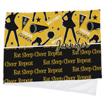 This design is a fun combo with a bright yellow and black. The two colors are a great contrast to one another. The top half of the design has a cheerleader sillhouette as well as words like "cheerleader" and "victory." The bottom half has a background that says eat, sleep, cheer, repeat. Your personalization goes right in between these two backgrounds right in the middle.