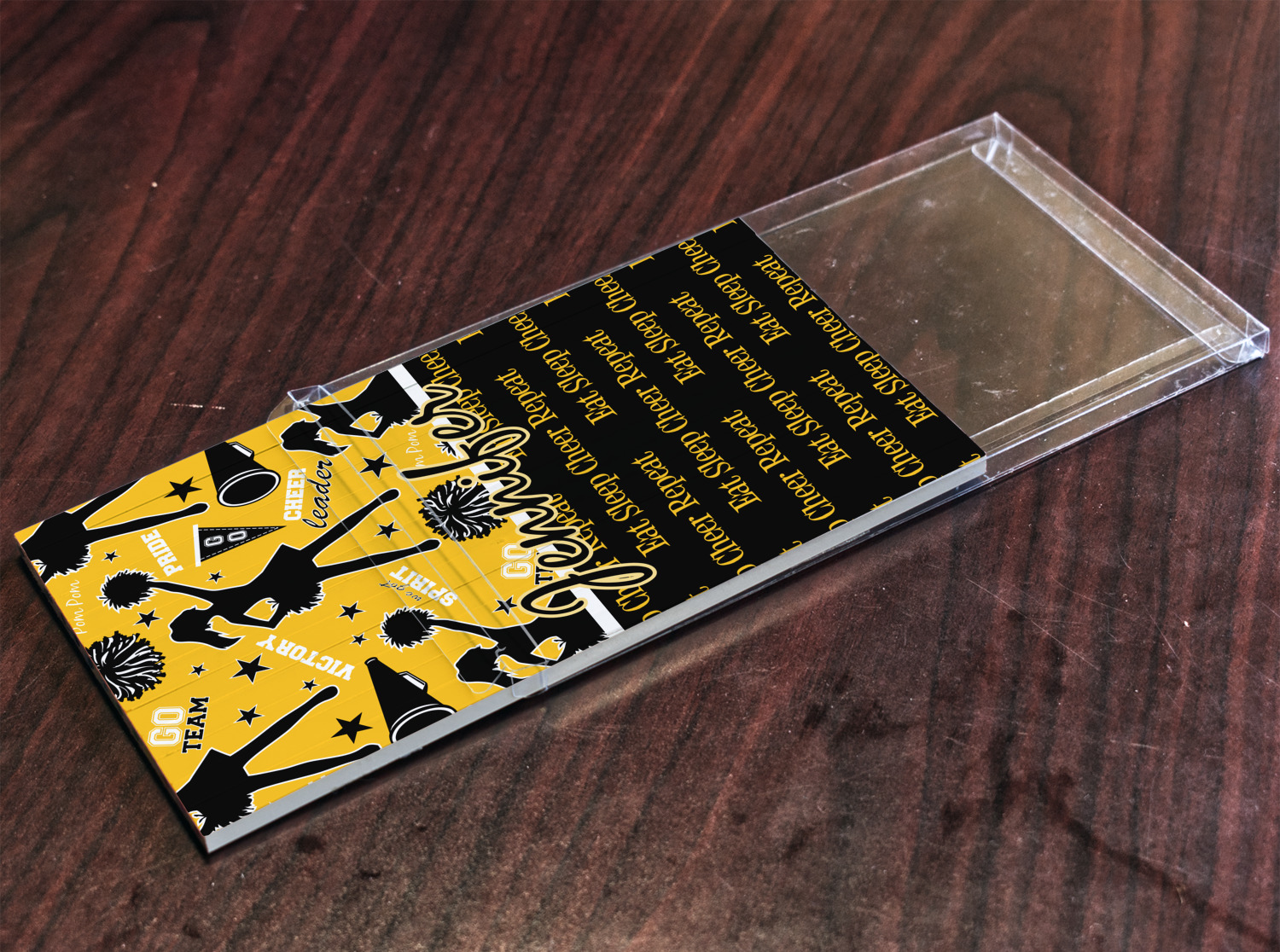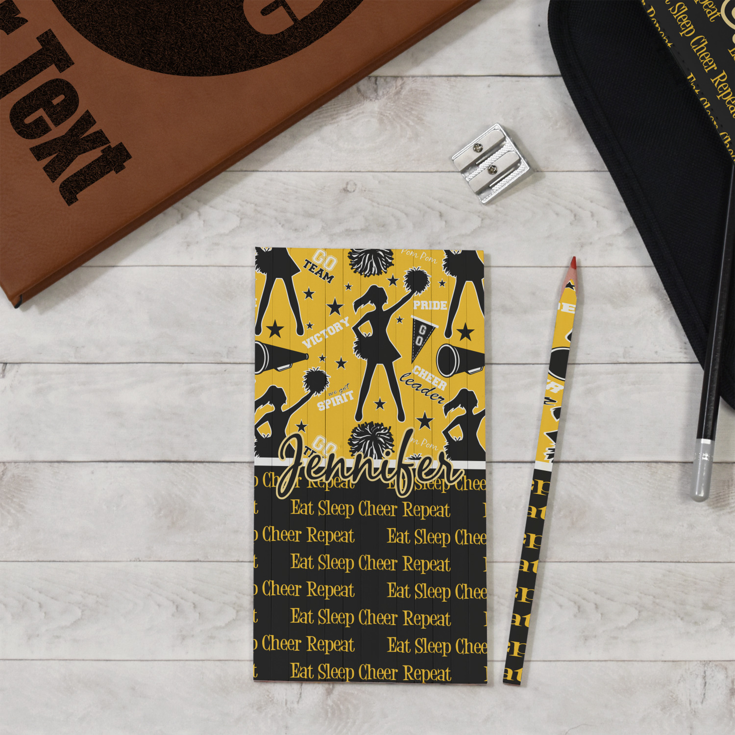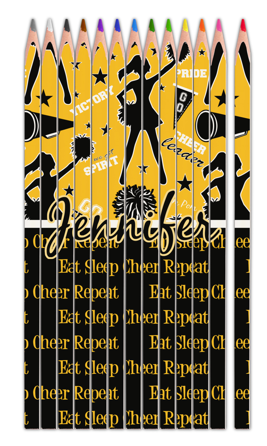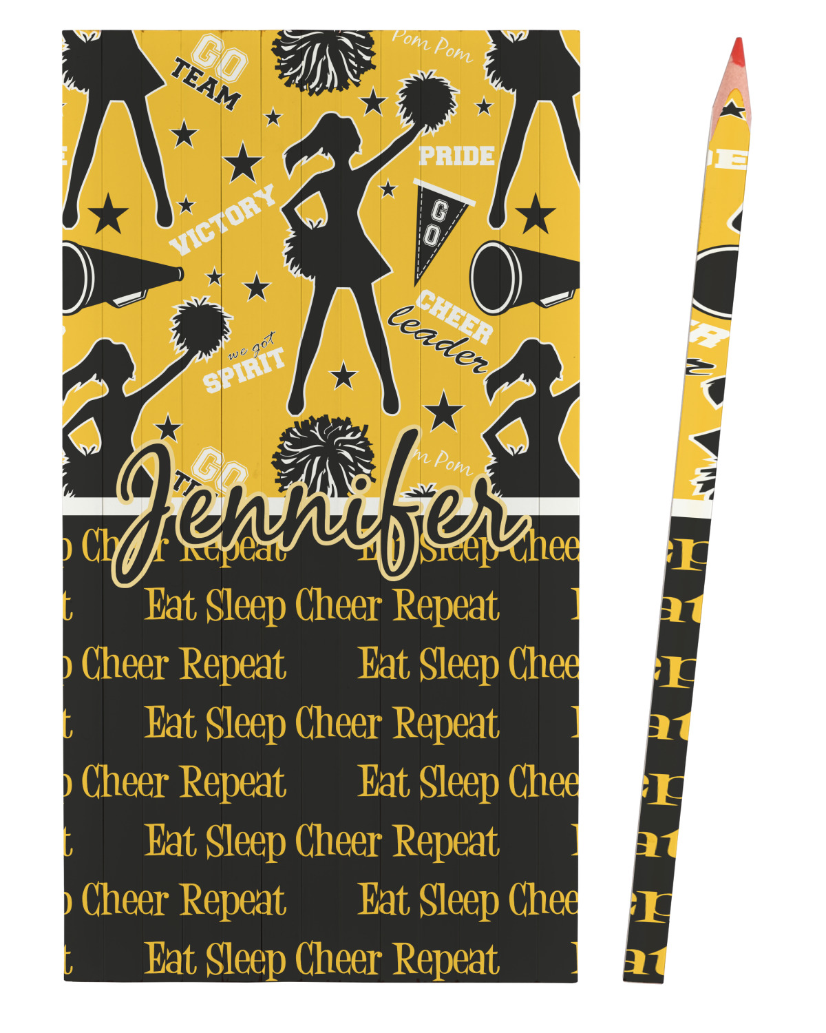 This design is a fun combo with a bright yellow and black. The two colors are a great contrast to one another. The top half of the design has a cheerleader sillhouette as well as words like "cheerleader" and "victory." The bottom half has a background that says eat, sleep, cheer, repeat. Your personalization goes right in between these two backgrounds right in the middle.