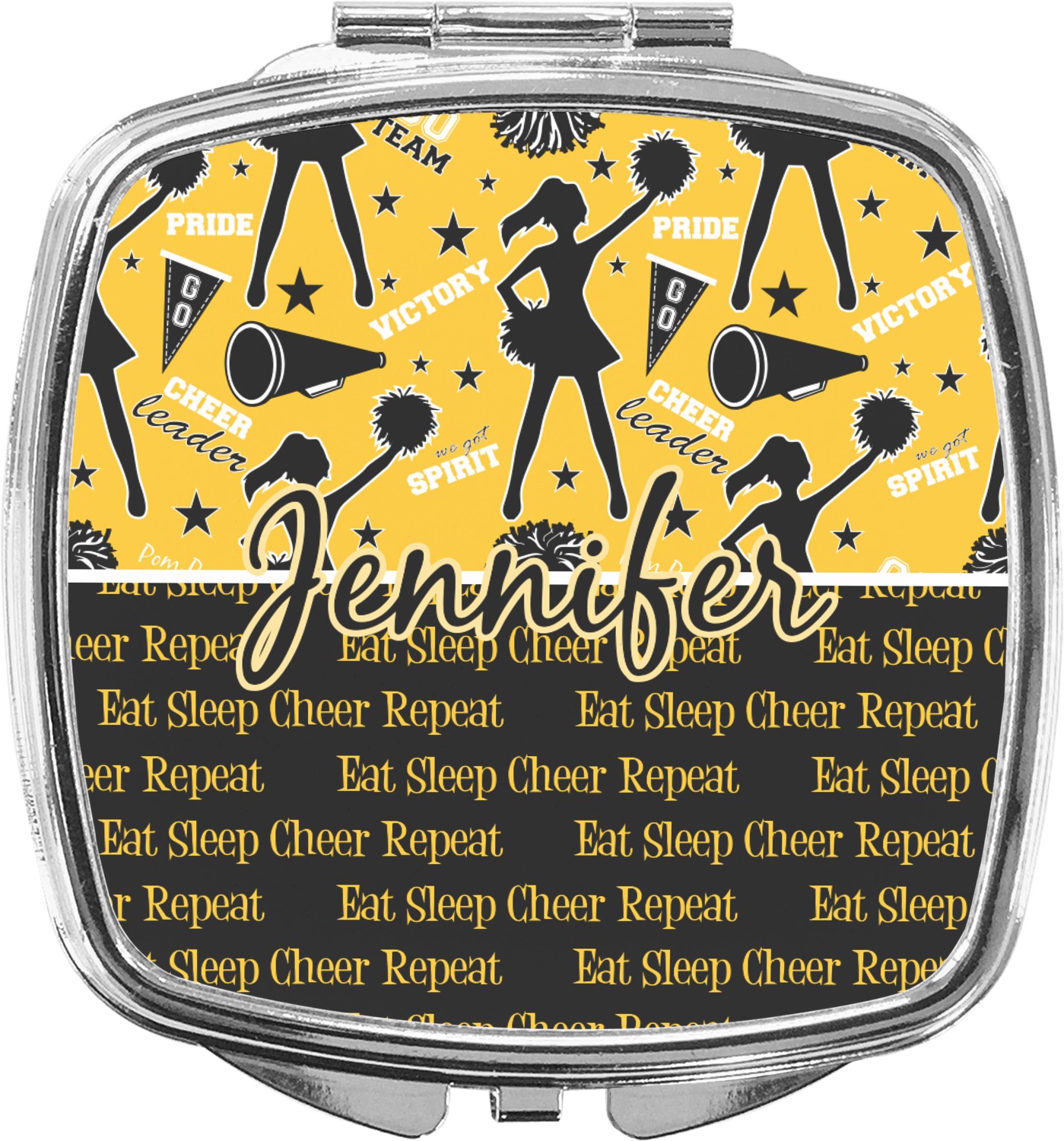 This design is a fun combo with a bright yellow and black. The two colors are a great contrast to one another. The top half of the design has a cheerleader sillhouette as well as words like "cheerleader" and "victory." The bottom half has a background that says eat, sleep, cheer, repeat. Your personalization goes right in between these two backgrounds right in the middle.