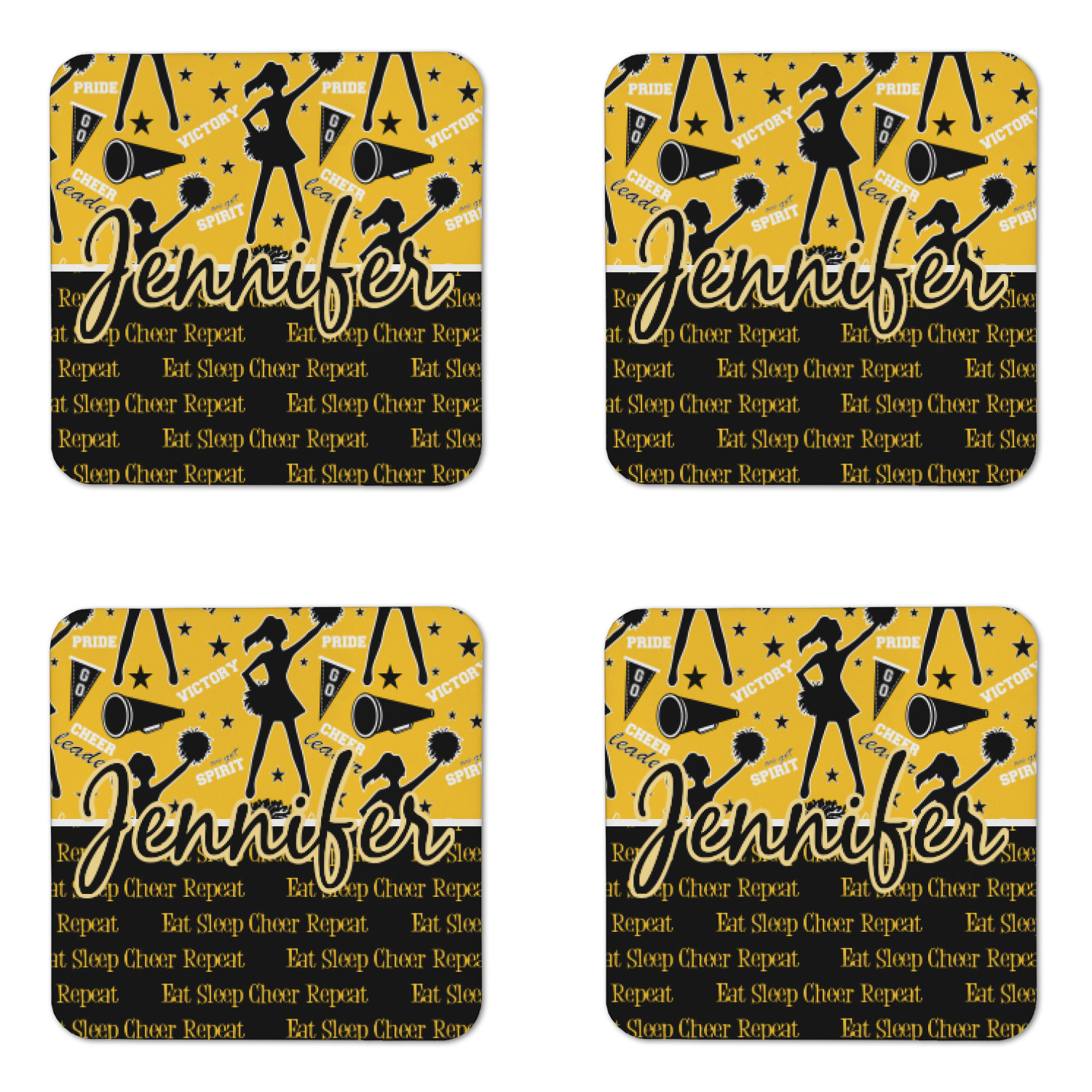 This design is a fun combo with a bright yellow and black. The two colors are a great contrast to one another. The top half of the design has a cheerleader sillhouette as well as words like "cheerleader" and "victory." The bottom half has a background that says eat, sleep, cheer, repeat. Your personalization goes right in between these two backgrounds right in the middle.