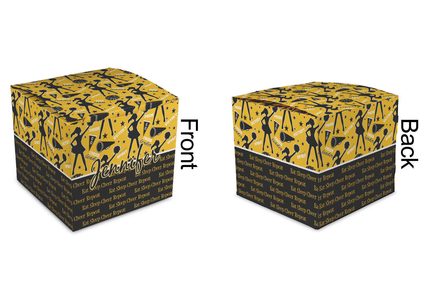 This design is a fun combo with a bright yellow and black. The two colors are a great contrast to one another. The top half of the design has a cheerleader sillhouette as well as words like "cheerleader" and "victory." The bottom half has a background that says eat, sleep, cheer, repeat. Your personalization goes right in between these two backgrounds right in the middle.