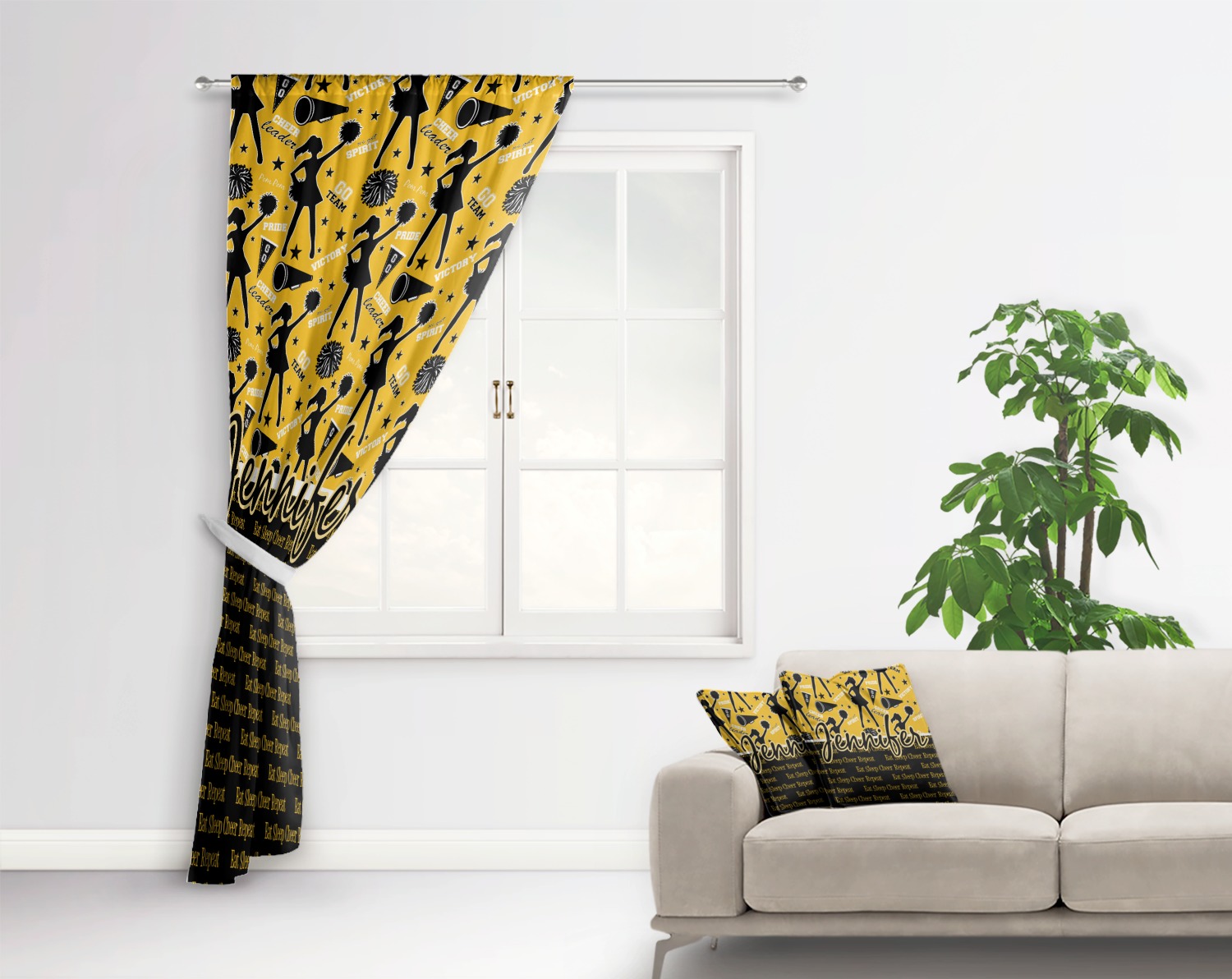 This design is a fun combo with a bright yellow and black. The two colors are a great contrast to one another. The top half of the design has a cheerleader sillhouette as well as words like "cheerleader" and "victory." The bottom half has a background that says eat, sleep, cheer, repeat. Your personalization goes right in between these two backgrounds right in the middle.