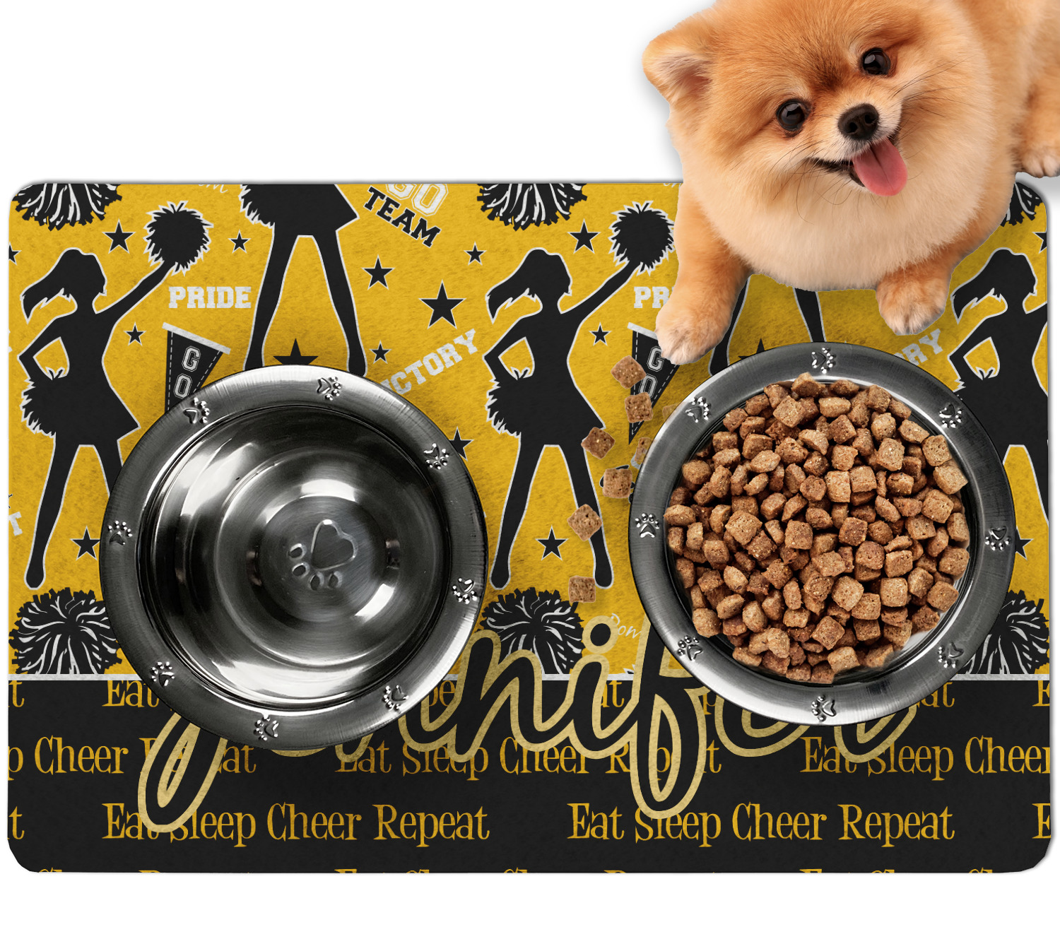 This design is a fun combo with a bright yellow and black. The two colors are a great contrast to one another. The top half of the design has a cheerleader sillhouette as well as words like "cheerleader" and "victory." The bottom half has a background that says eat, sleep, cheer, repeat. Your personalization goes right in between these two backgrounds right in the middle.