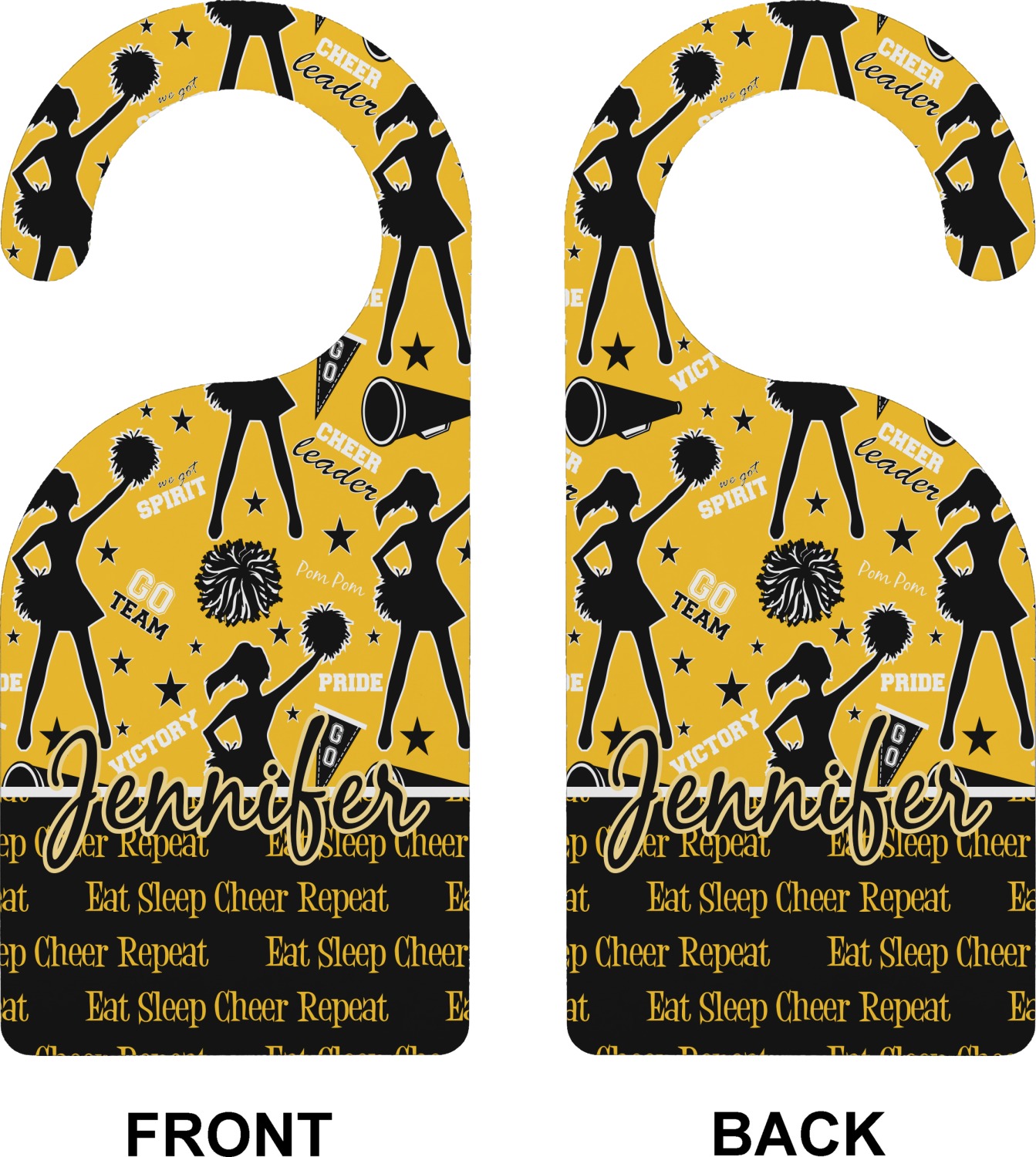 This design is a fun combo with a bright yellow and black. The two colors are a great contrast to one another. The top half of the design has a cheerleader sillhouette as well as words like "cheerleader" and "victory." The bottom half has a background that says eat, sleep, cheer, repeat. Your personalization goes right in between these two backgrounds right in the middle.