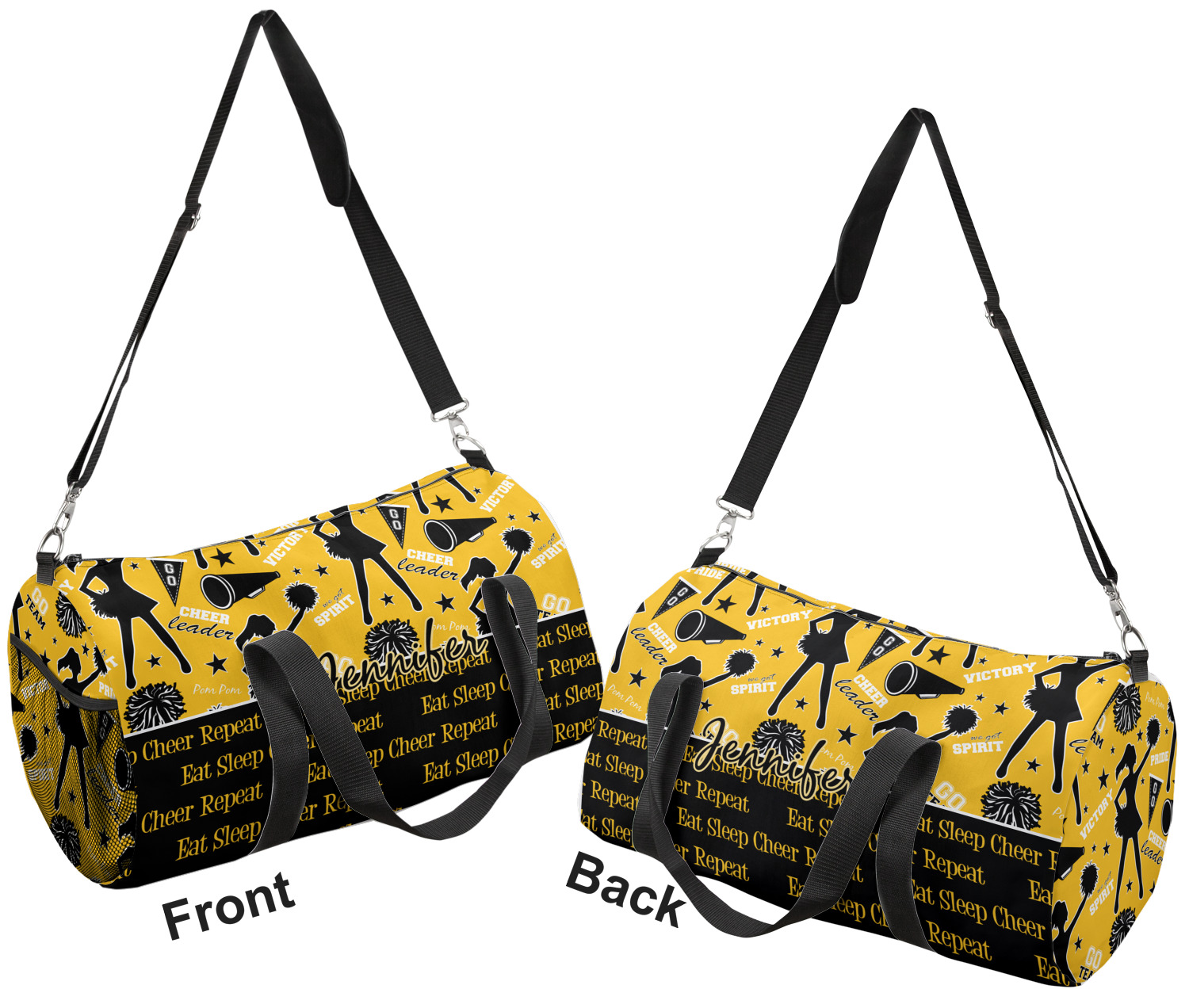 This duffle is a sturdy bag made of a canvas material. It comes in two sizes: Small (19"W x 9.5"H x 9.5"D) and Large (23"W x 12"H x 12"D). The bag is a cylindrical shape with a black adjustable strap and two handles. On one side is an elastic pouch to put a waterbottle or other small item. Your product will be sublimated with your design and is able to be designed on the front, back, and sides. Be sure to remember that the straps may cut into parts of your design if you upload your own artwork.
