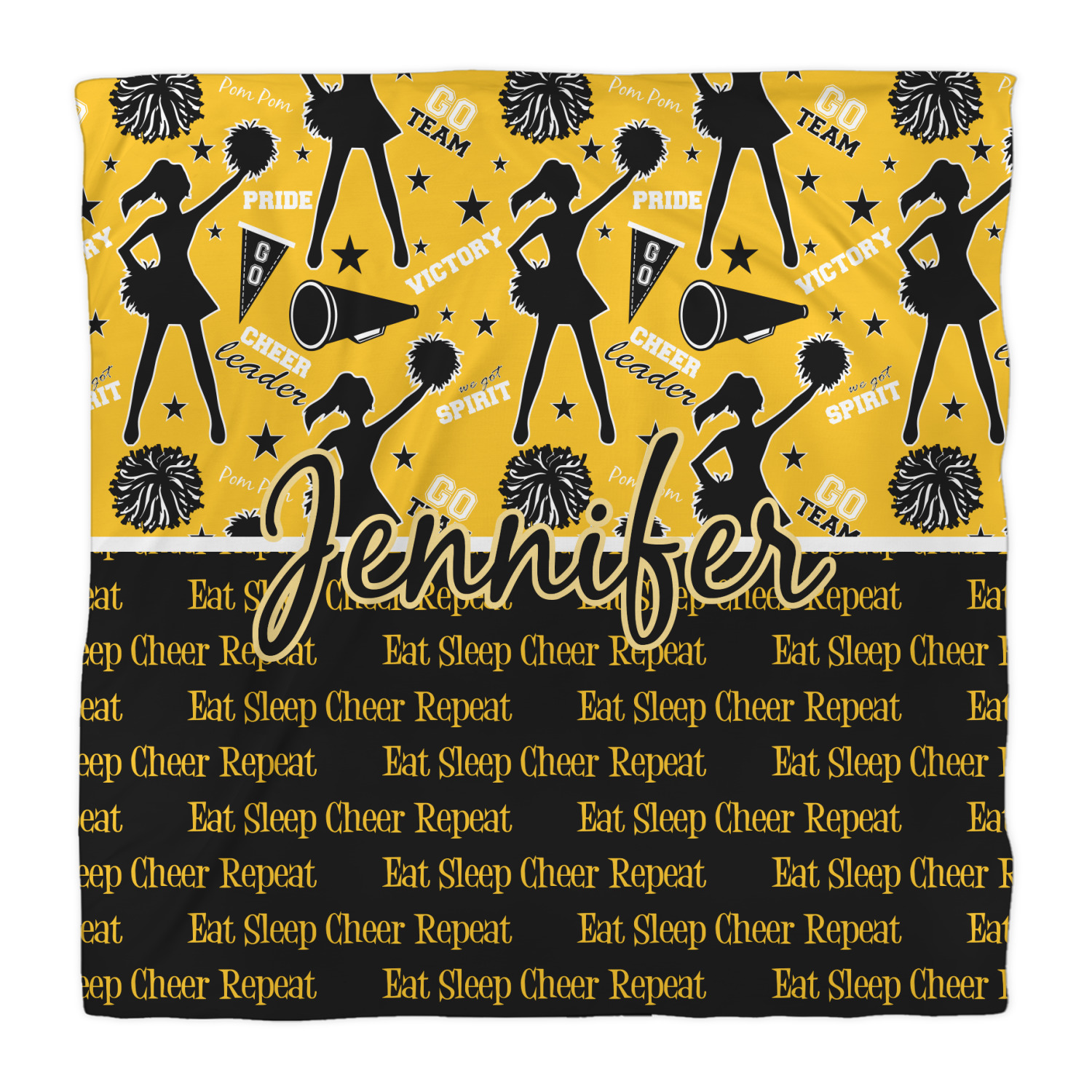 This design is a fun combo with a bright yellow and black. The two colors are a great contrast to one another. The top half of the design has a cheerleader sillhouette as well as words like "cheerleader" and "victory." The bottom half has a background that says eat, sleep, cheer, repeat. Your personalization goes right in between these two backgrounds right in the middle.