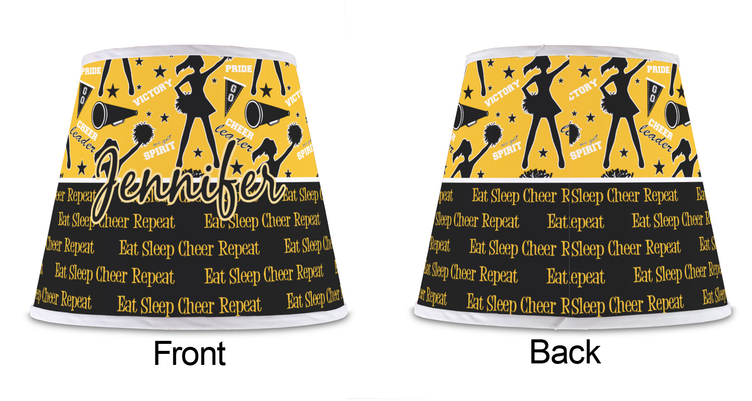 This design is a fun combo with a bright yellow and black. The two colors are a great contrast to one another. The top half of the design has a cheerleader sillhouette as well as words like "cheerleader" and "victory." The bottom half has a background that says eat, sleep, cheer, repeat. Your personalization goes right in between these two backgrounds right in the middle.