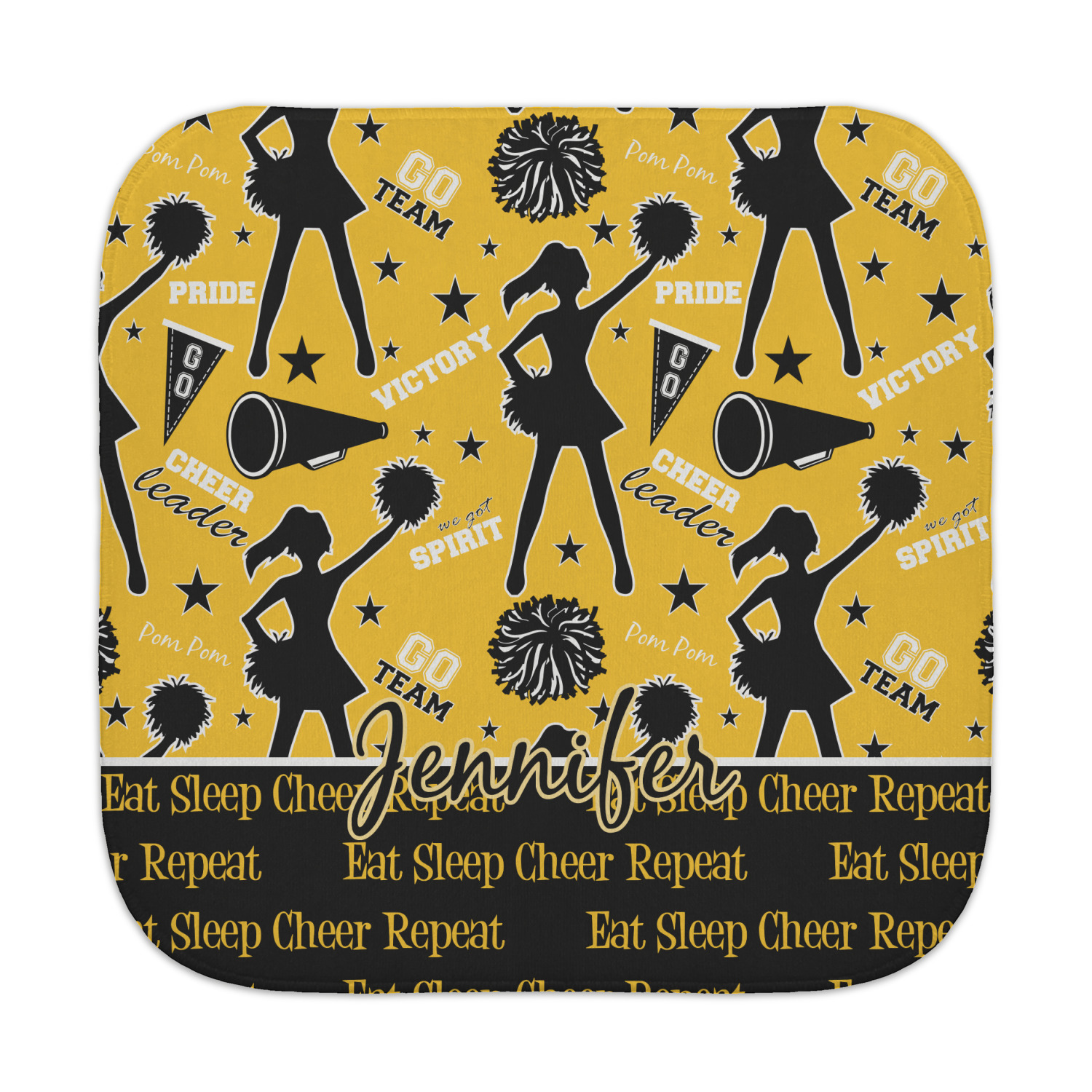 This design is a fun combo with a bright yellow and black. The two colors are a great contrast to one another. The top half of the design has a cheerleader sillhouette as well as words like "cheerleader" and "victory." The bottom half has a background that says eat, sleep, cheer, repeat. Your personalization goes right in between these two backgrounds right in the middle.