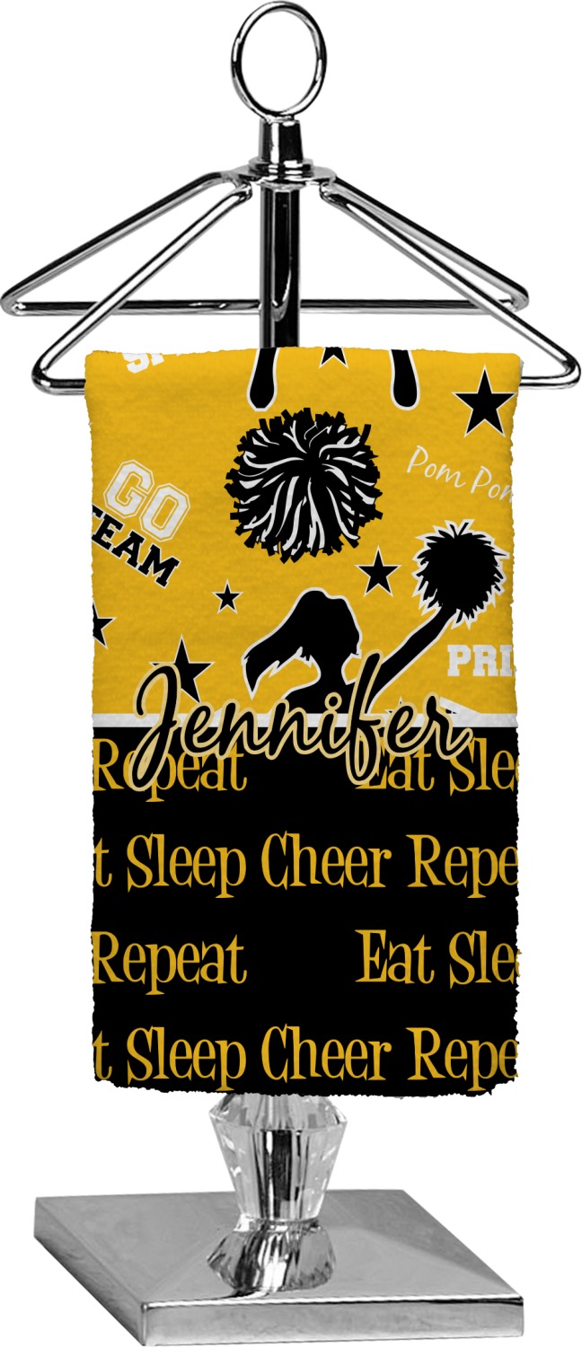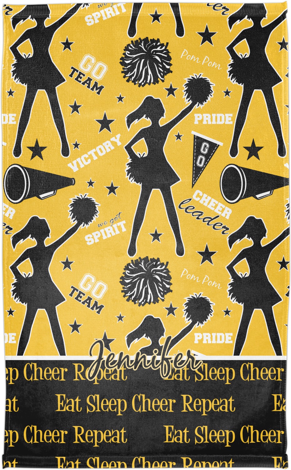 This design is a fun combo with a bright yellow and black. The two colors are a great contrast to one another. The top half of the design has a cheerleader sillhouette as well as words like "cheerleader" and "victory." The bottom half has a background that says eat, sleep, cheer, repeat. Your personalization goes right in between these two backgrounds right in the middle.