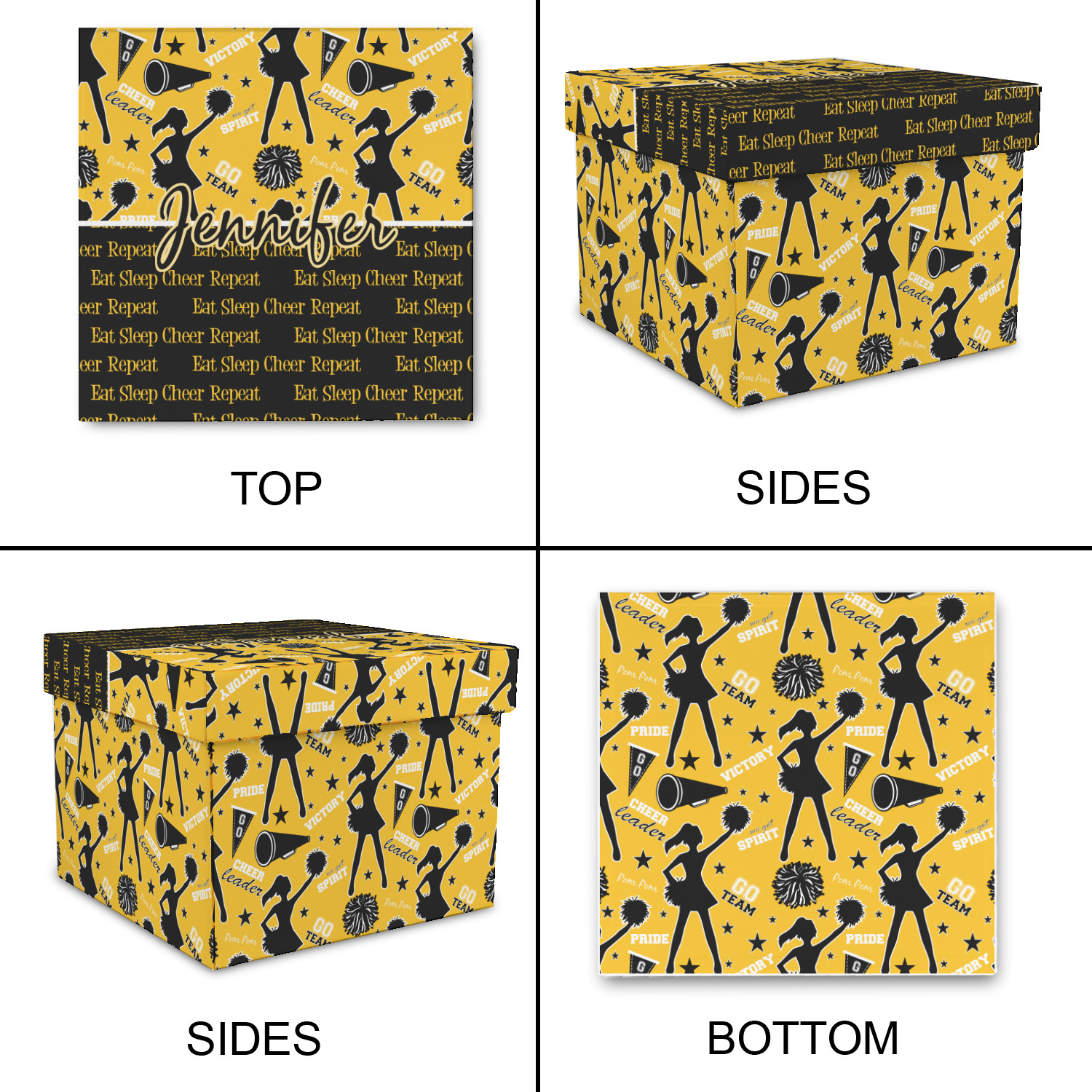 This design is a fun combo with a bright yellow and black. The two colors are a great contrast to one another. The top half of the design has a cheerleader sillhouette as well as words like "cheerleader" and "victory." The bottom half has a background that says eat, sleep, cheer, repeat. Your personalization goes right in between these two backgrounds right in the middle.